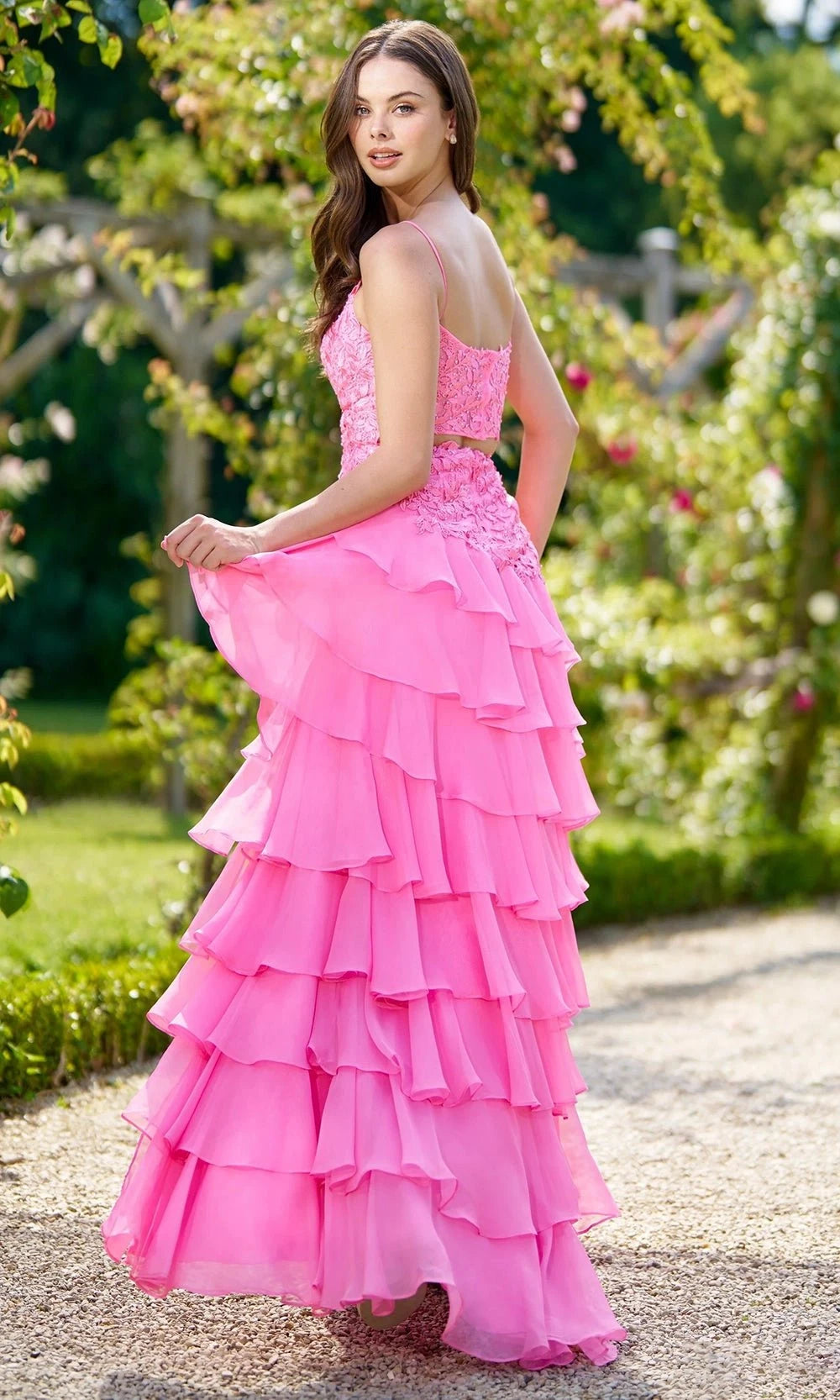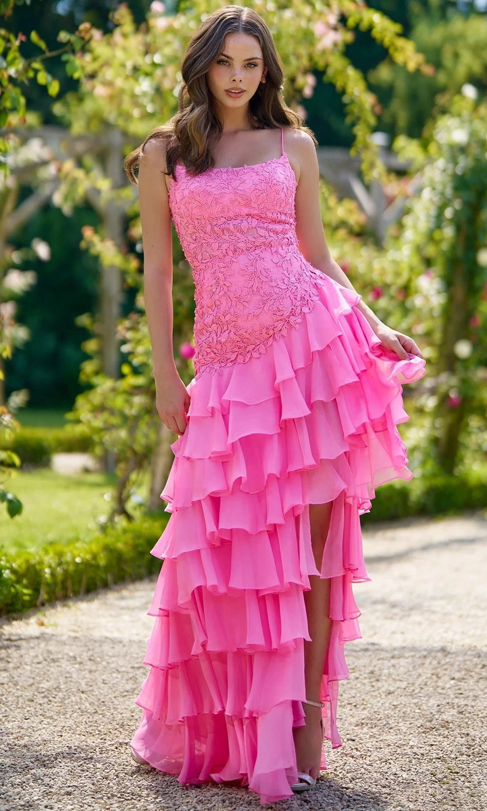 Step into a vision of romance with the Sherri Hill 56961. This sleeveless gown features a flattering scoop neckline and a leaf lace bodice that enhances its feminine appeal. The cascading tiered ruffle A-line skirt adds movement and whimsy, making it an eye-catching ensemble for any upscale event. Crafted from soft chiffon, this gown balances elegance with a touch of playfulness. For those who love a statement look, the Sherri Hill 56961 is a must-have addition to any wardrobe. Model is wearing Bright Pink color.