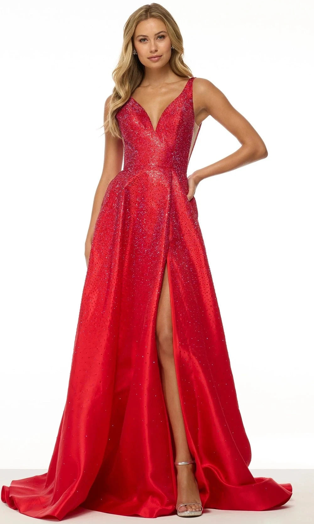 Elevate your evening attire with the Sherri Hill 56990 gown, a perfect blend of classic design and modern flair. This A-line gown is adorned with hot fix embellishments that add a subtle shimmer, ensuring you stand out at any event. The plunging V-neckline complements the sheer side panels, offering a hint of allure while maintaining elegance. The skirt features a tasteful slit, providing ease of movement and a contemporary touch. Ideal for proms, galas, or any formal occasion, the Sherri Hill 56990 promises a memorable entrance. Model is wearing Red color.