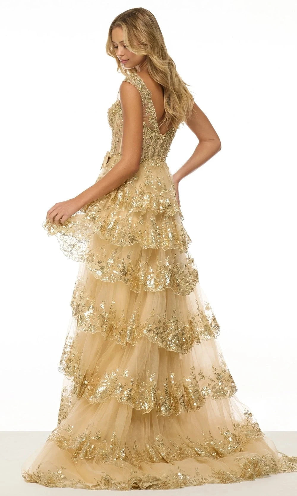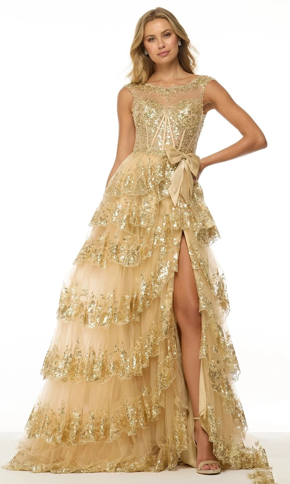 | Details: | Sequin, Embroidery, Corset Bodice, Bow Accent, High Slit, Layered Tiered Skirt |