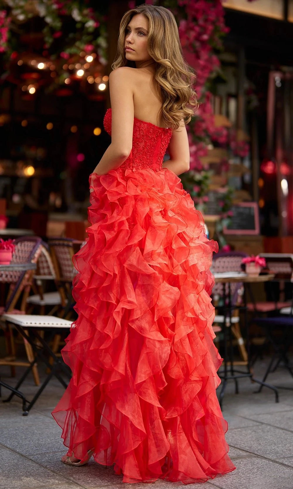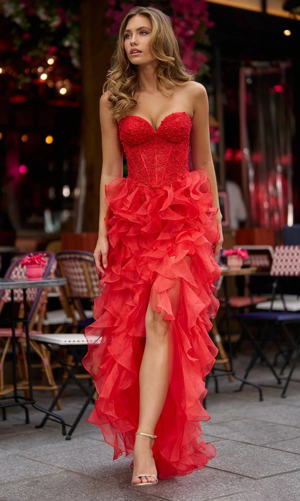 | Details: | Ruffled High-Low Skirt, Corset Bodice, Thigh Slit, Floral Appliques, Strapless |