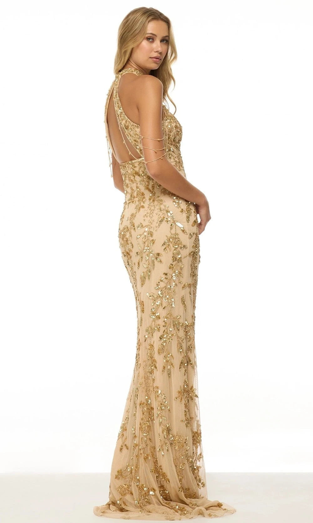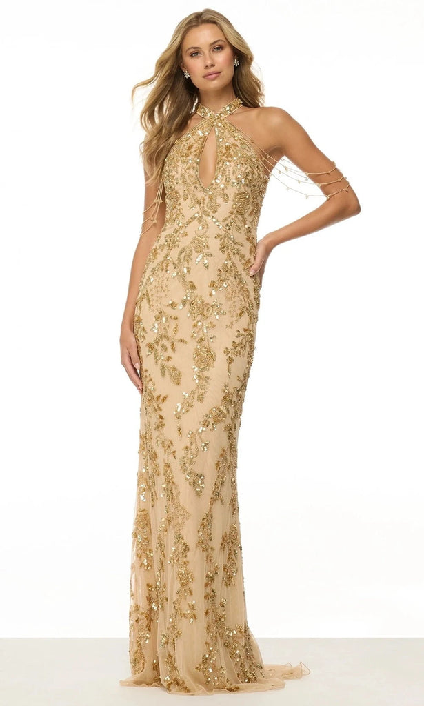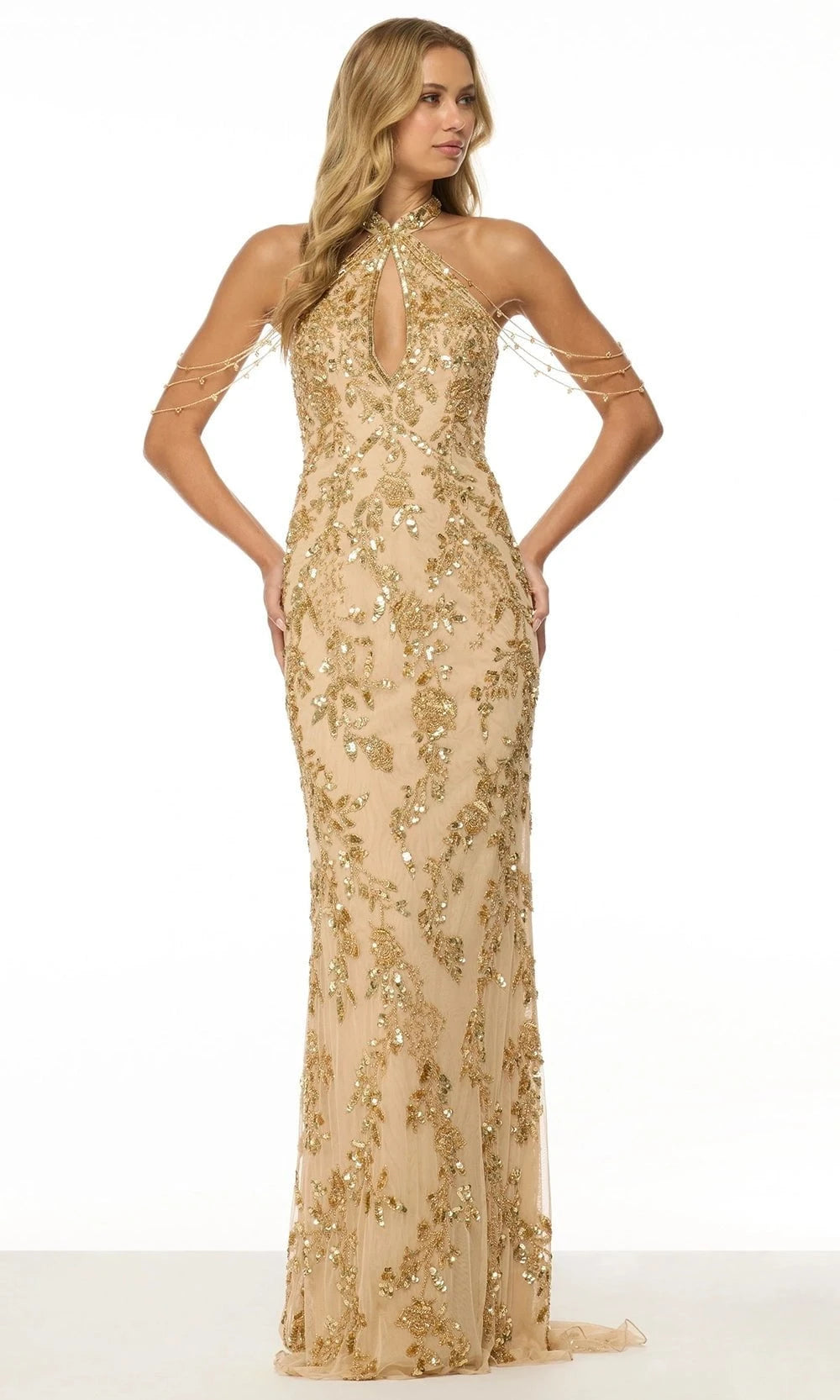 Make a statement in the mesmerizing Sherri Hill 57021, a dress designed for those who love glamour and sophistication. Featuring a halter neckline with a bold keyhole cutout, this dress strikes the perfect balance between elegance and allure. The fitted bodice is lavishly adorned with floral motifs of shimmering sequins and beaded. Cascading beaded strands that drape gracefully along the arms gives an extra wow factor. Flowing into a floor-length hem with a soft train, this Sherri Hill 57021 is the ultimate choice for high-profile events and unforgettable moments. Model is wearing Gold color.
