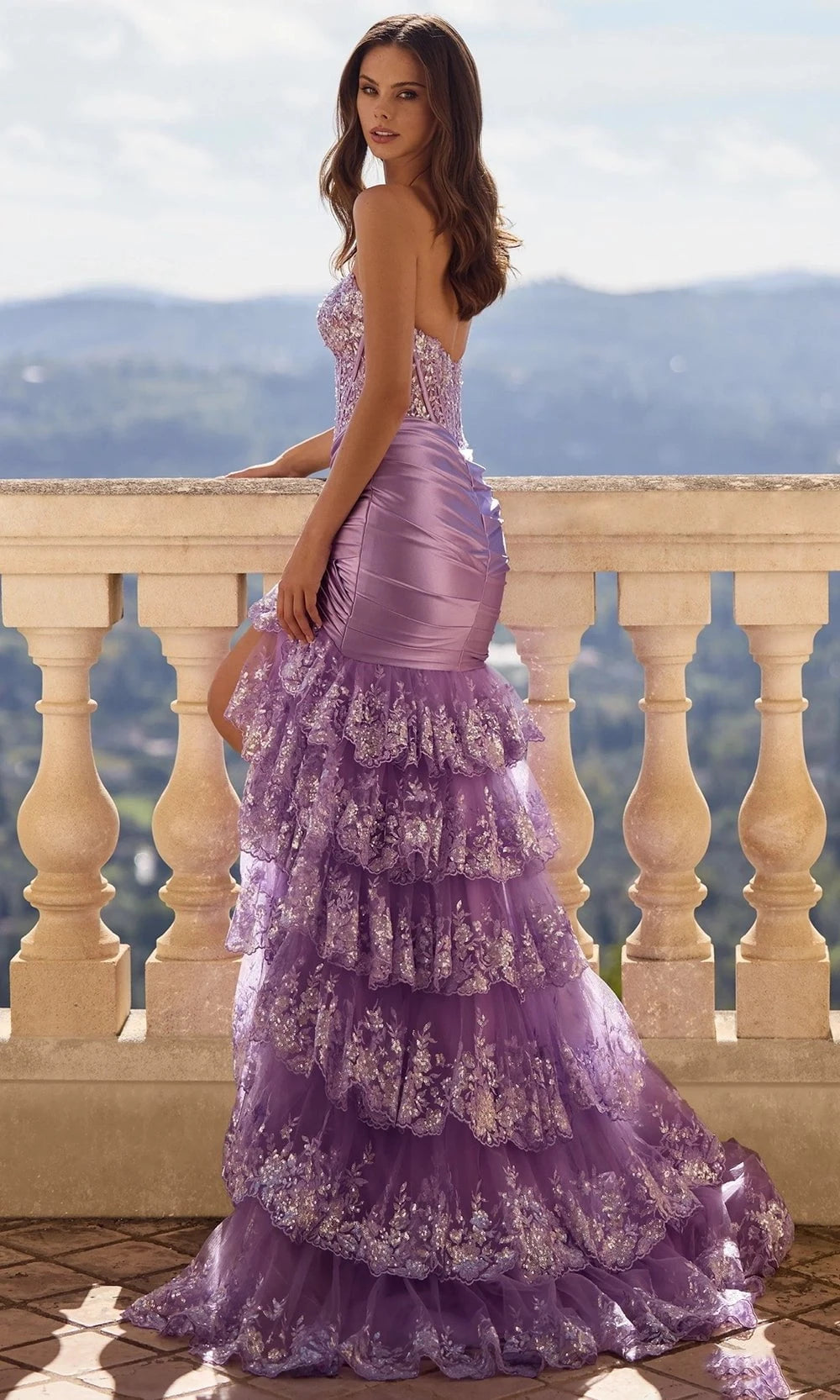 Unveil timeless beauty in the Sherri Hill 57043, where a beautifully embroidered and sequin bodice takes center stage. The ruched waist enhances the trumpet silhouette, leading to a stunning tiered ruffle detailing and thigh-high leg slit that adds a dramatic flair. Whether gracing a gala or making an entrance at prom, this enchanting gown is designed to captivate. The Sherri Hill 57043 is the perfect statement of sophistication and grace. Model is wearing Lilac color.