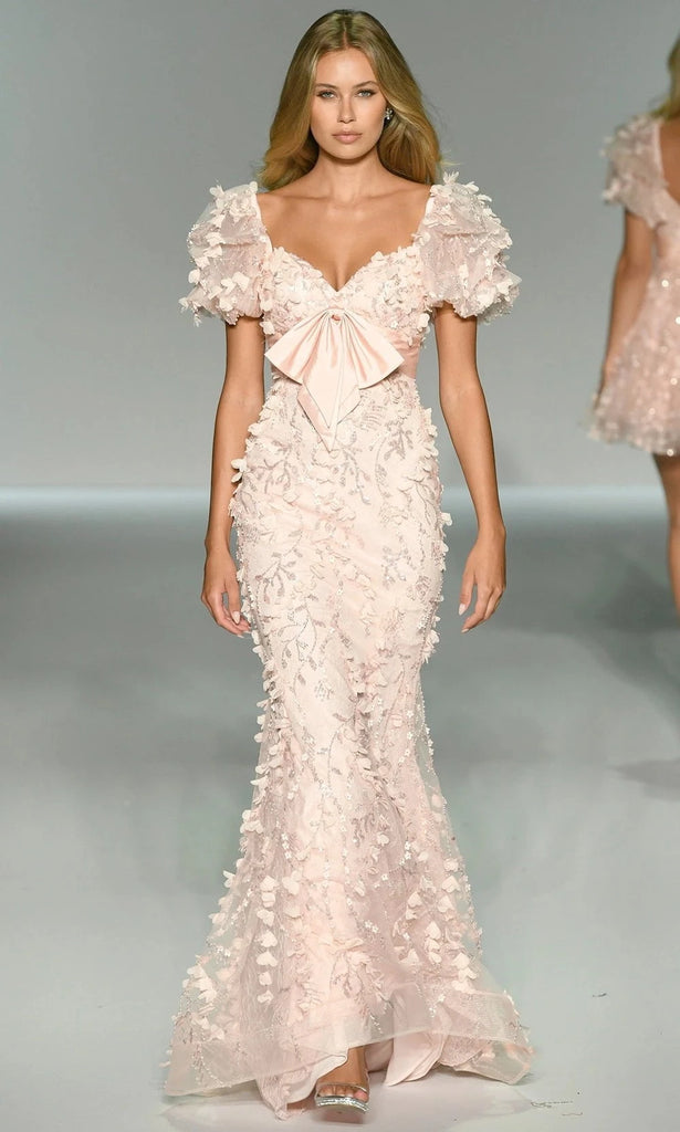 | Details: | Embroidered Floral Appliques, Puff Sleeves, Statement Bow |