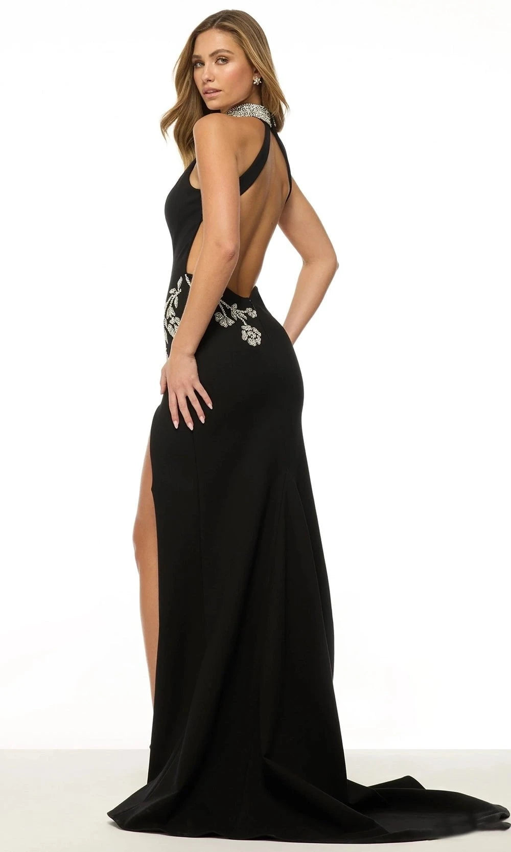 | Details: | Embellished Neckline, Beaded Floral Embroidery, Thigh-High Slit, Open Back |