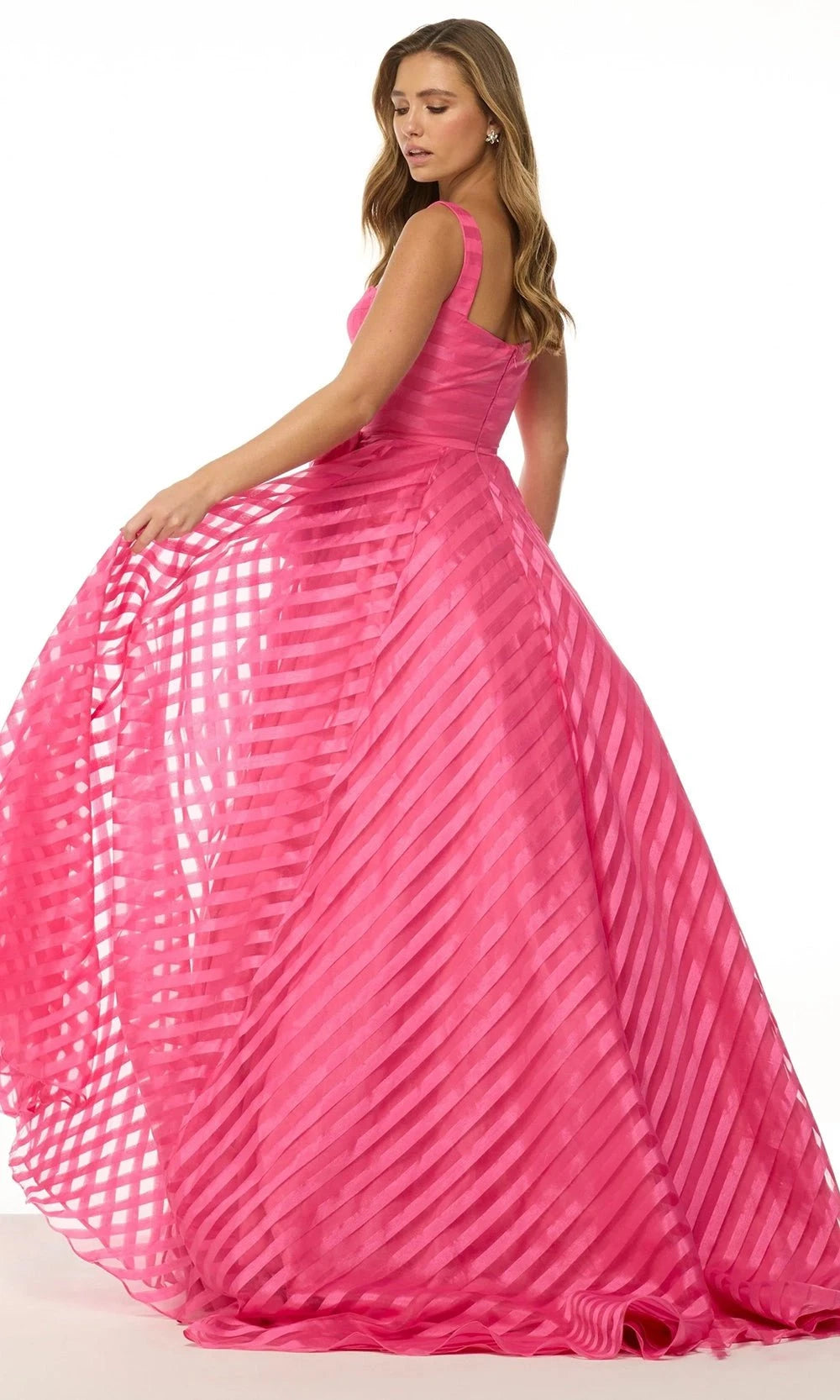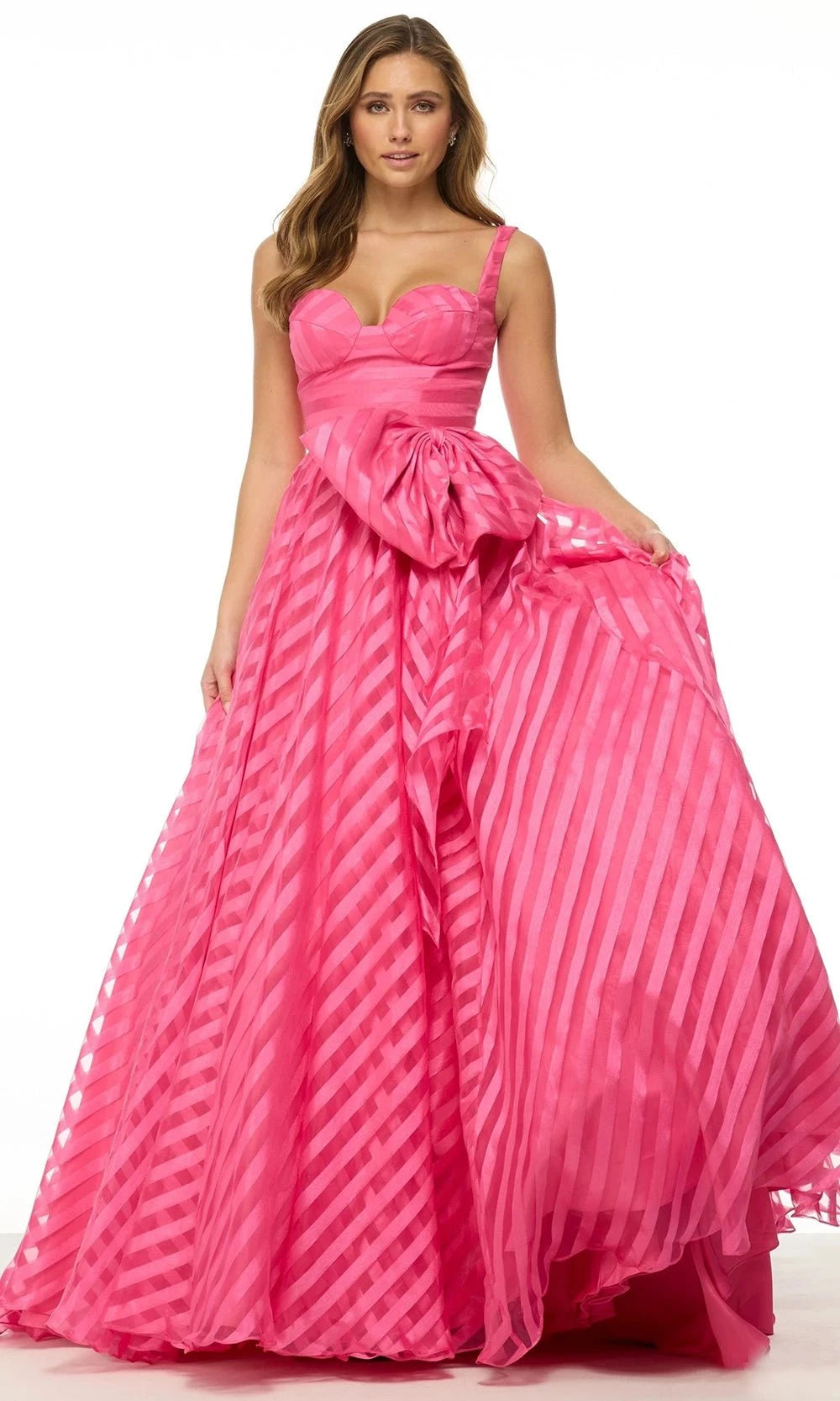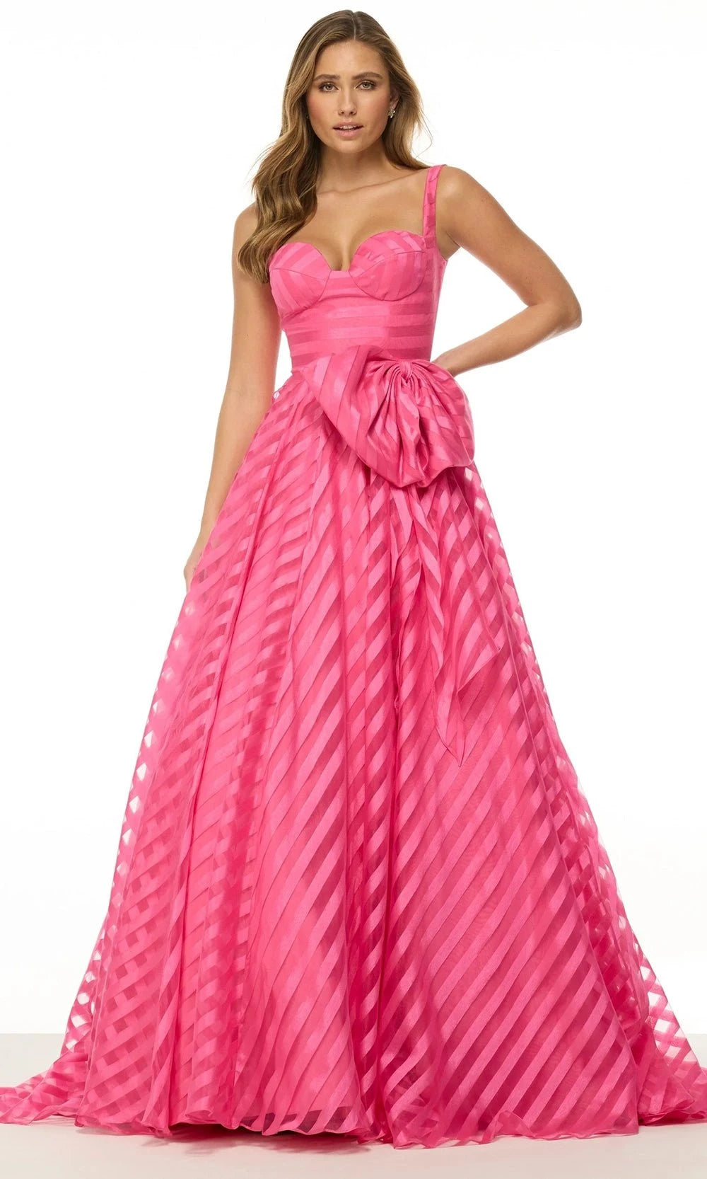 Upgrade your style with the effortlessly chic Sherri Hill 57116 masterpiece. Crafted from luxurious organza, this stunning gown features a structured corset bodice for a flattering fit. The striped design enhances the gown ethereal and captivating beauty. The oversized bow accent adds a touch of drama, while the layered ballgown skirt flows beautifully into grand sweep train. Perfect for making a statement at special events, this Sherri Hill 57116 is a must-have. Model is wearing Bright Pink color.