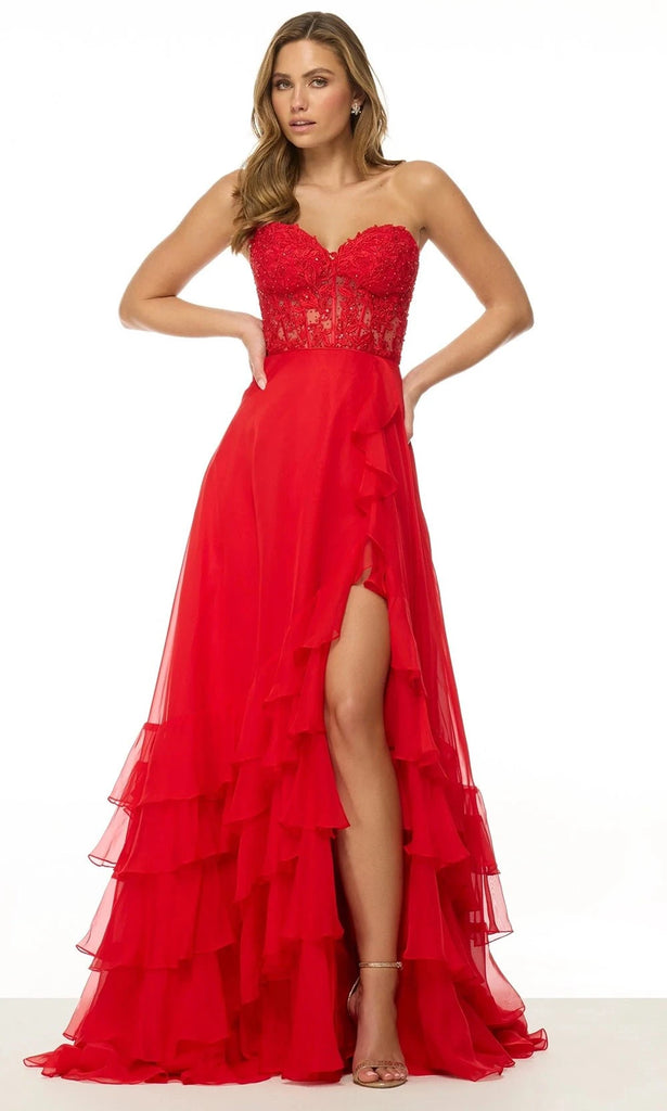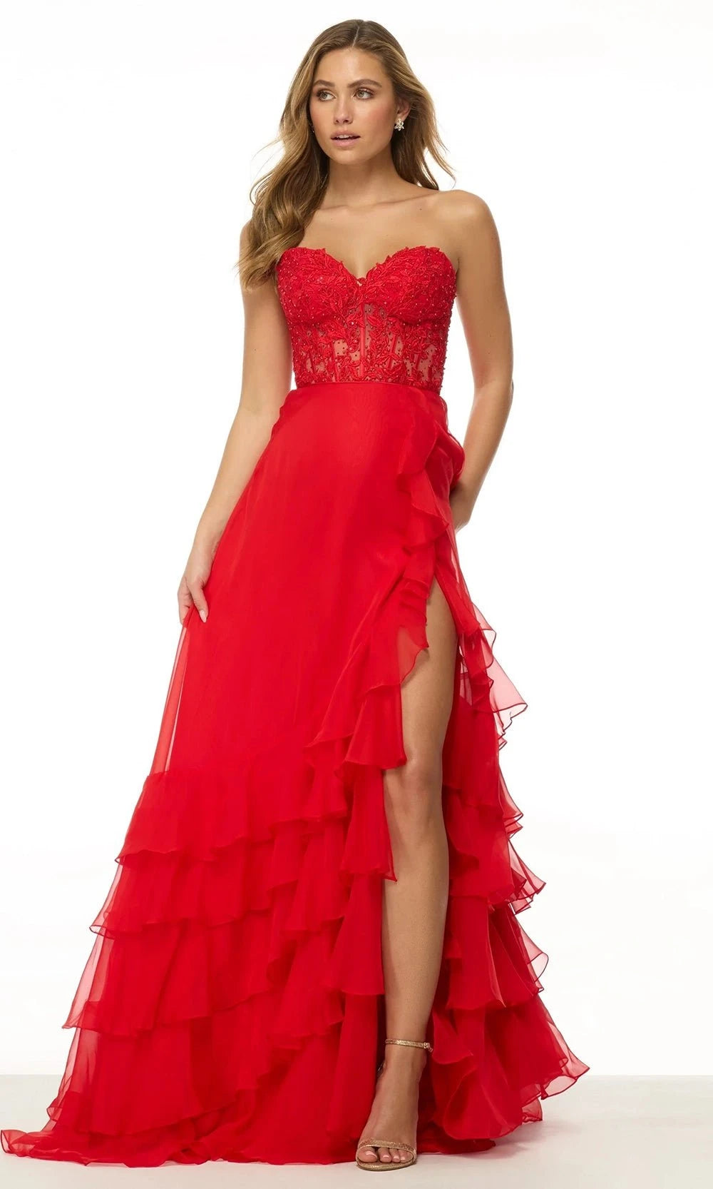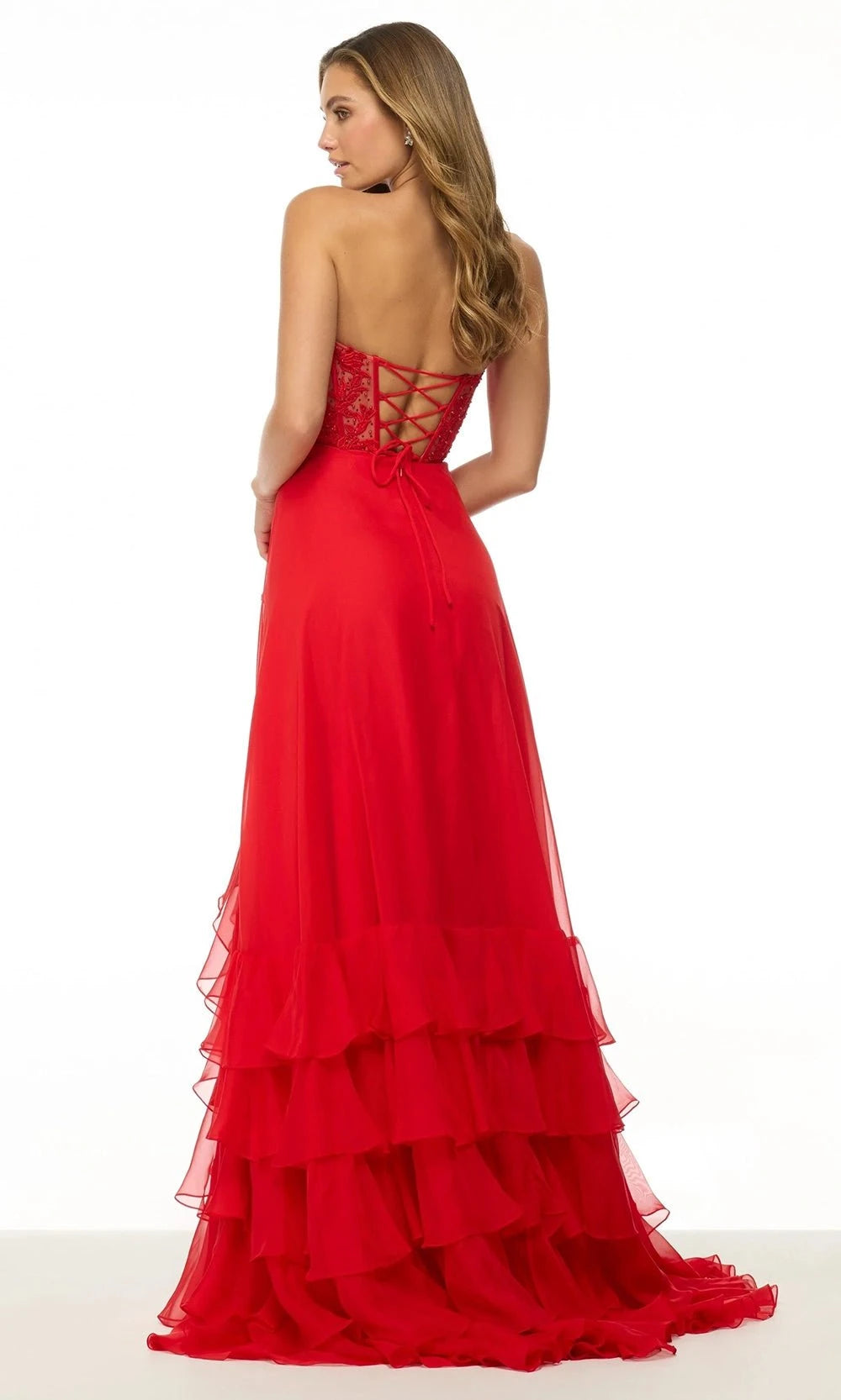 Details: Strapless, Leaf Lace, Beaded, Corset Bodice, High Slit, Tiered Ruffle Skirt