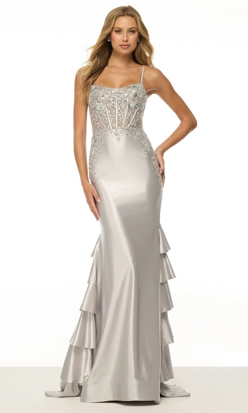 Appear in elegance in the Sherri Hill 57189, a luxurious jersey dress adorned with beaded lace embellishments. This refined piece boasts scoop neckline with spaghetti straps, and a corset-style bodice. The sheath silhouette of the skirt enhances your shape. Ruffled design in the back adds an extra touch of drama, while intricate details on the bodice provide a regal finish. Perfect for prom, pageants, or upscale occasions, this Sherri Hill 57189 style is an exquisite choice for a grand entrance. Model is wearing Silver color.
