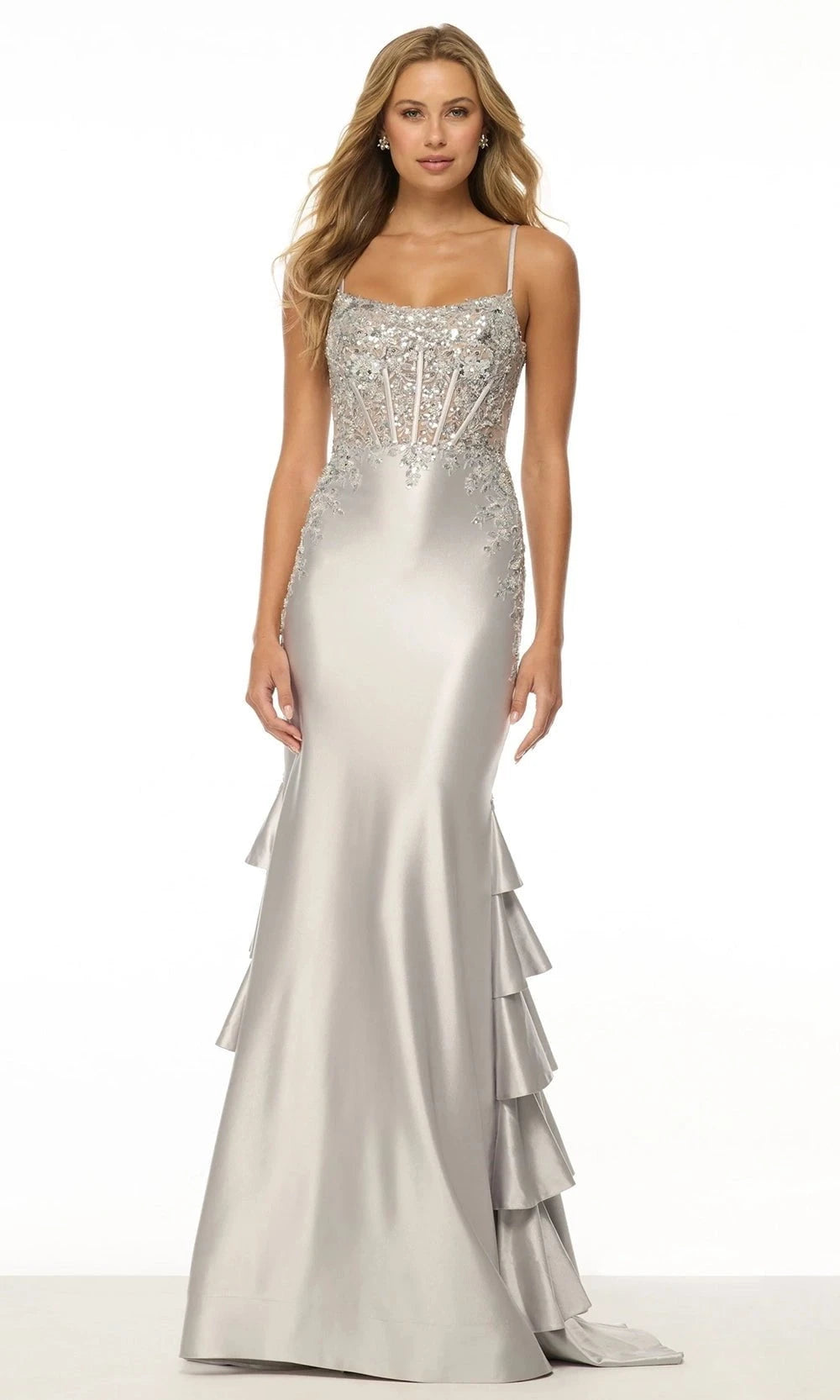| Details: | Spaghetti Straps, Corset Bodice, Ruffled Back, Beaded Lace |