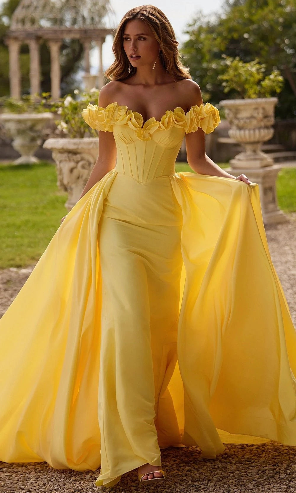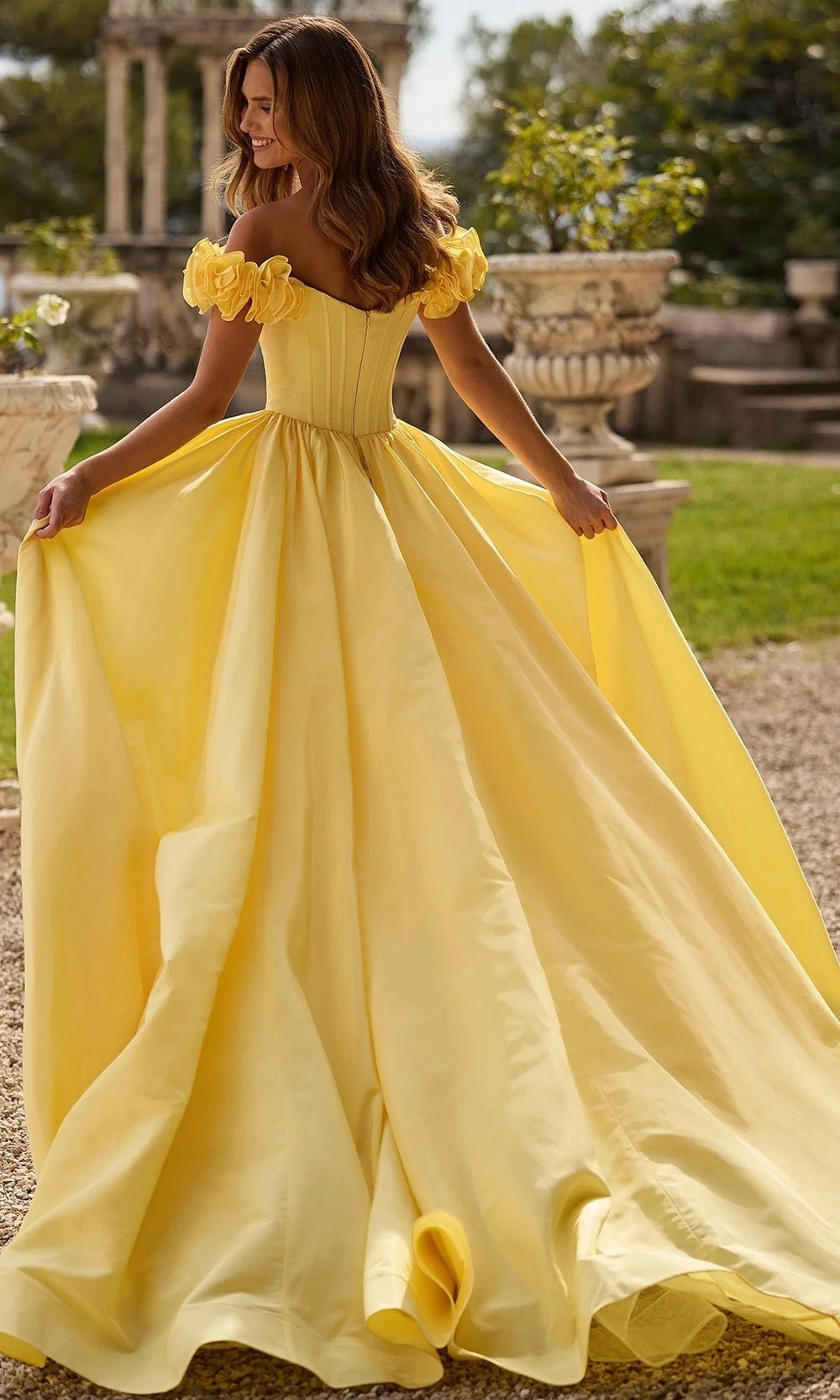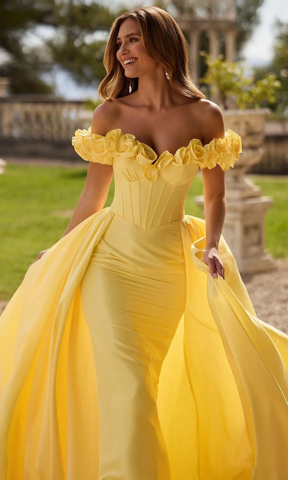 Grace the room with timeless elegance in the Sherri Hill 57200. This gown showcases ruffle design in the off shoulder sweetheart neckline and cap sleeves, exuding a fairytale charm. The structured corset bodice accentuates the waist, providing a flattering silhouette that seamlessly transitions into a sheath-style skirt. An A-line overskirt adds drama and movement, ensuring a grand entrance. Crafted from luxurious taffeta, this gown offers both sophistication and grace. The Sherri Hill 57200 is a perfect choice for making a statement at any glamorous occasion. Model is wearing Yellow color.