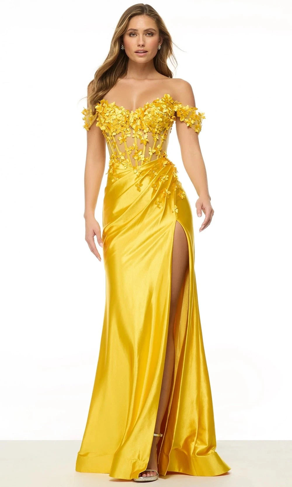 Make a stunning entrance in the Sherri Hill 57201 gown, a breathtaking design that blends romance and elegance effortlessly. It features an off-the-shoulder sweetheart neckline with a sheer corset bodice adorned with floral appliques for a whimsical touch. The sheath silhouette gracefully contours the body before cascading into a flowing draped skirt with a daring high slit. Ideal for those seeking a sophisticated yet alluring look, this Sherri Hill 57201 is perfect for formal events, proms, or pageants. Model is wearing Yellow color.