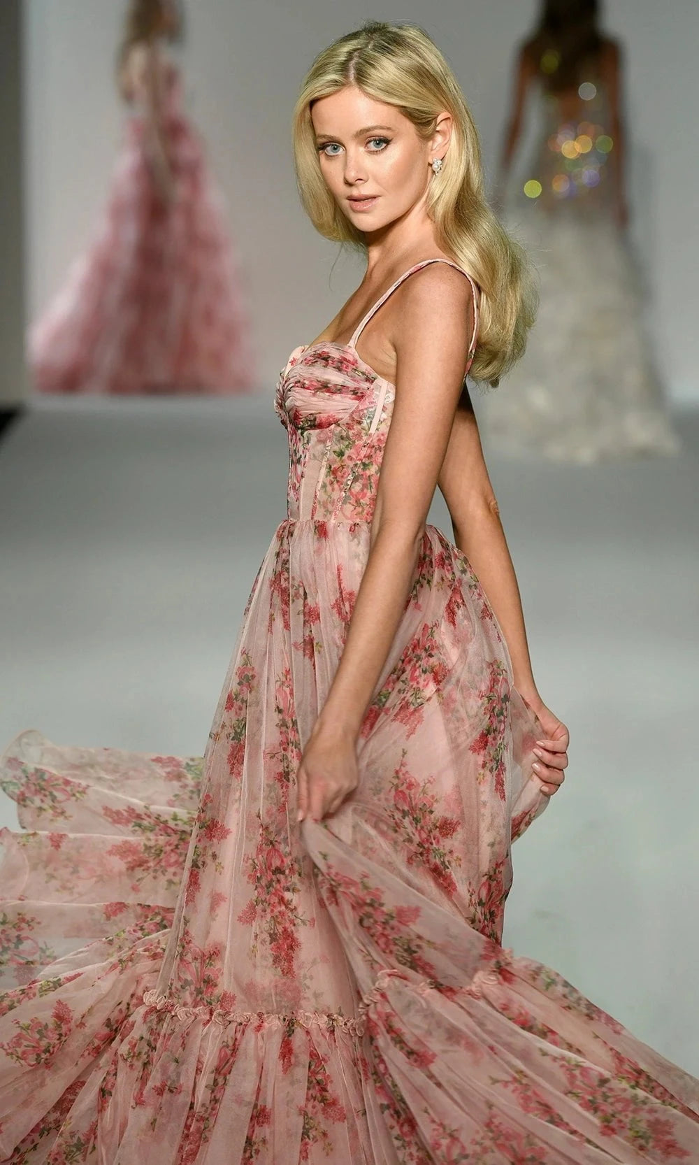| Details: | Sleeveless, Floral Print, Corset Bodice, Layered Skirt |
