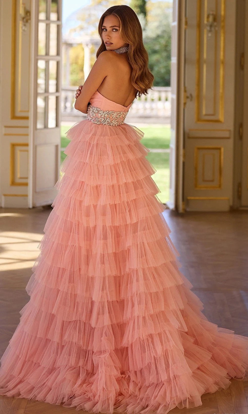 | Details: | Layered Ruffles, Beaded Waistband, Strapless, Choker, Cutout |