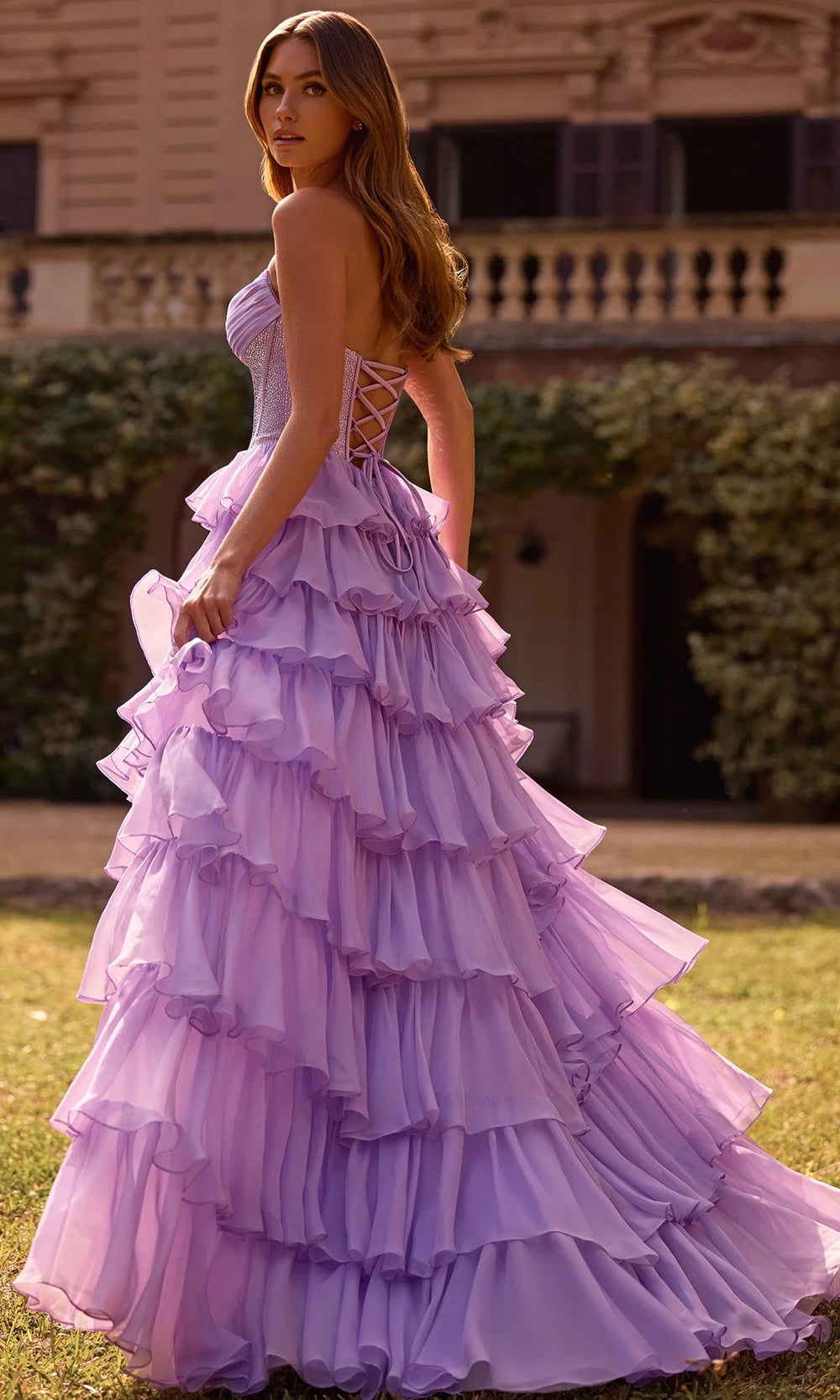 Unforgettable glamour unfolds in this Sherri Hill 57288 extraordinary gown that radiates elegance and edge. It showcases a fully embellished corset bodice with vertical boning that contours the body while highlighting the Basque waist. The front features a soft scoop neckline, while the back stuns with a dramatic lace-up design. Ruffled chiffon tiers drift down the A-line silhouette, infusing the skirt with soft volume and captivating movement. A sweeping train trails behind while a high slit reveals just enough, giving the ensemble a regal yet contemporary finish. Sherri Hill 57288 is ideal for anyone seeking high-impact sophistication. Model is wearing Lilac color.
