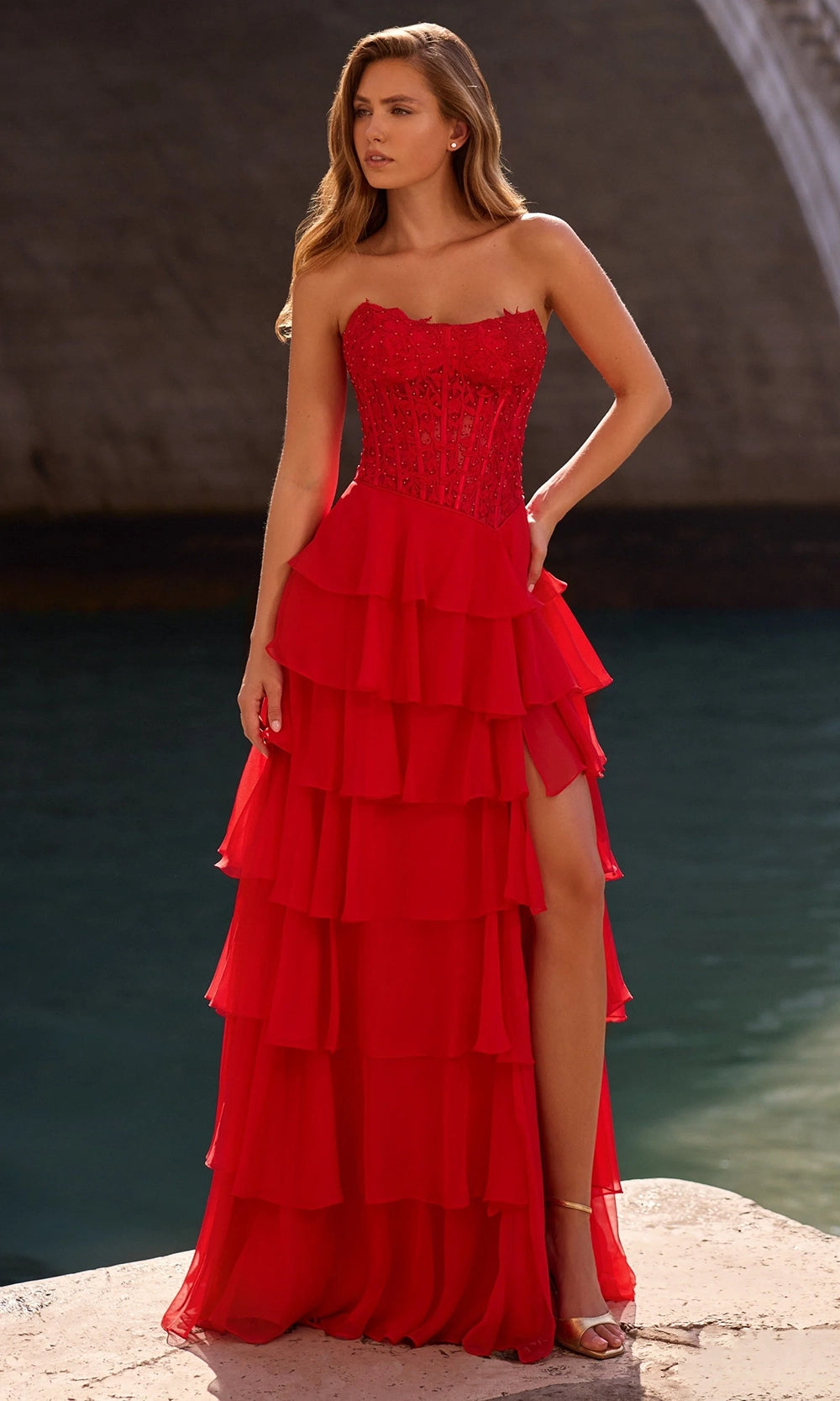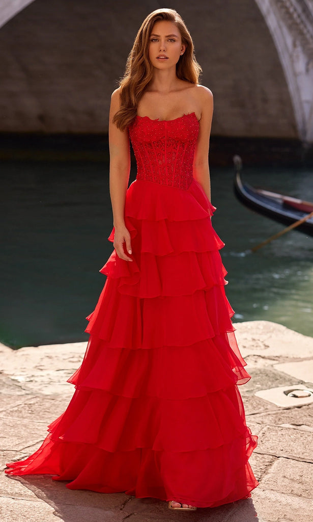 Intricately embellished and gracefully flowing, the Sherri Hill 57336 long gown is a celebration of texture and poise. Sparkling beadwork and leaf lace appliques enrich the structured corset bodice, while the ruffled tiers of the chiffon skirt bring lightness and drama. A daring high slit enhances the sweeping A-line silhouette, adding allure and movement to each step. Designed for those who appreciate structure and softness in harmony, this piece is completed with captivating strapless scoop neckline and mid-open back. With Sherri Hill 57336, experience the charm of refined elegance with a fashion-forward edge. Model is wearing Red color.
