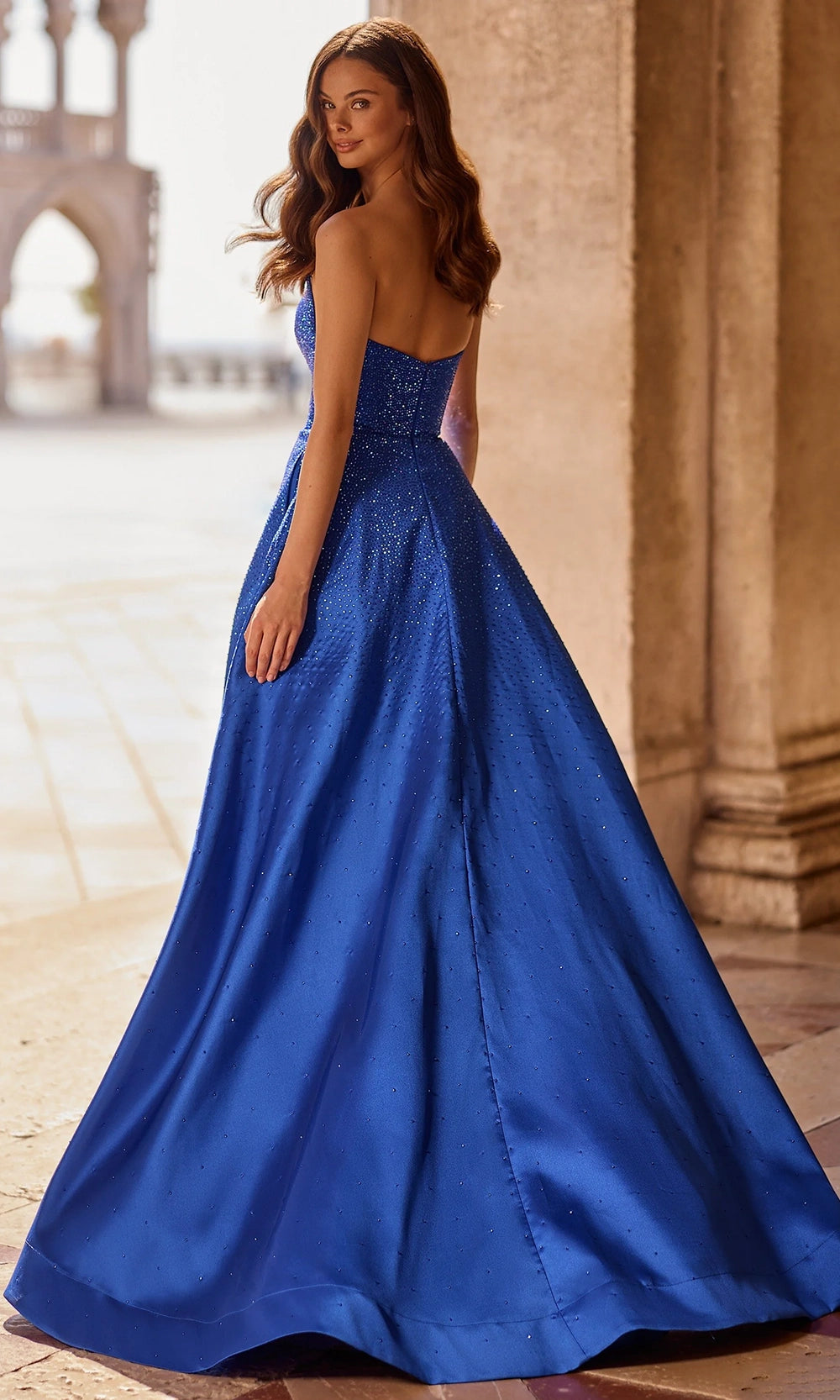 A vision of timeless sophistication, this Sherri Hill 57402 strapless gown captures every gaze with its sleek, modern glamour. The structured bodice glistens under the light with beaded embellishments that add a touch of luxury to the design. A defined waistline enhances the figure, while the voluminous A-line skirt flows gracefully, featuring a daring thigh-high slit that adds movement and allure. Perfect for formal galas and prom nights, this piece delivers elegance in motion, blending confidence and refinement effortlessly. Make your entrance unforgettable in Sherri Hill 57402. Model is wearing Royal color.