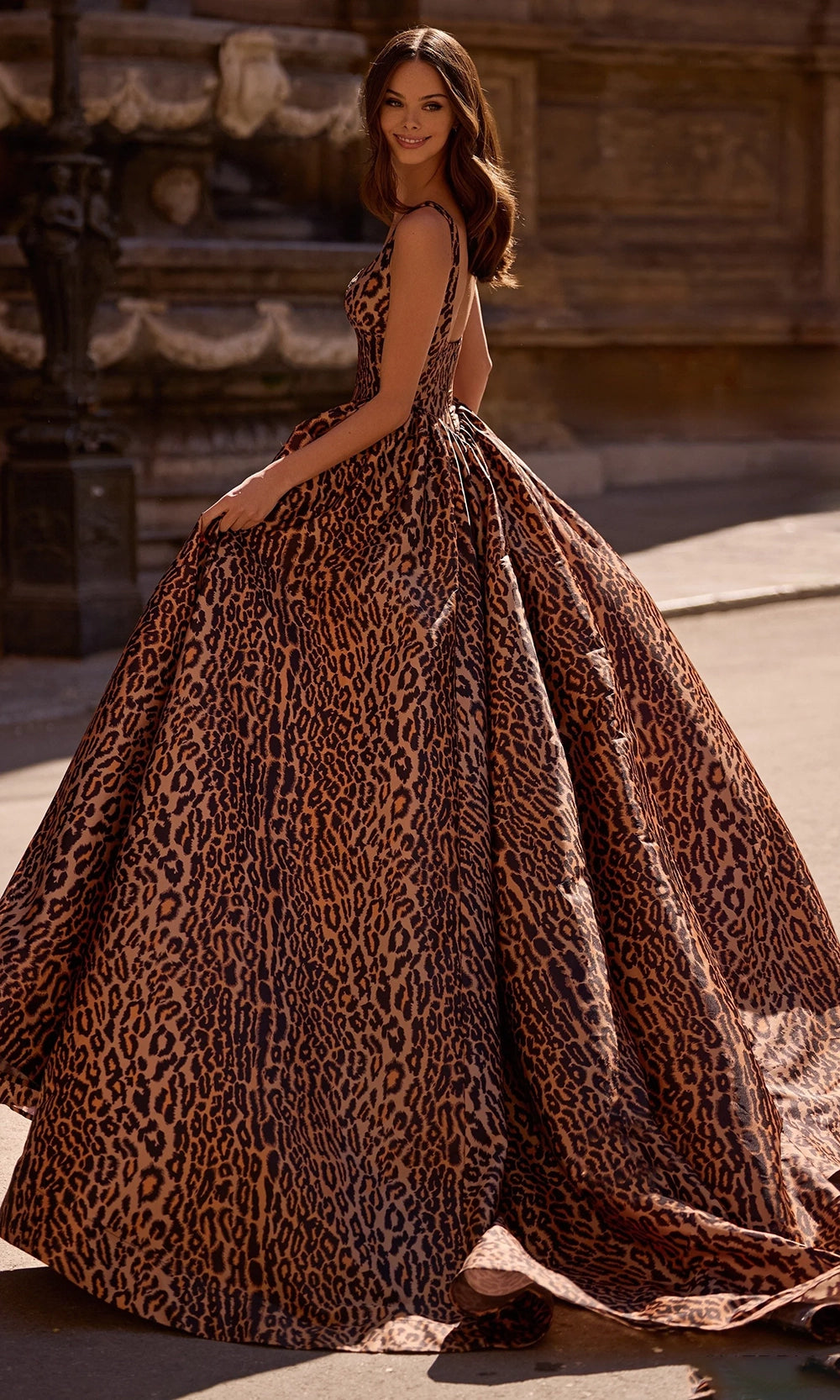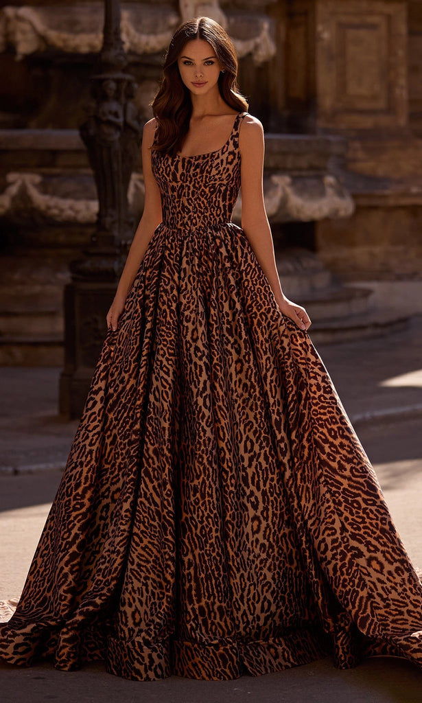 | Details: | High Slit Skirt, Open Back, Sleeveless Bodice, Floor Sweeping Train, Animal Print |