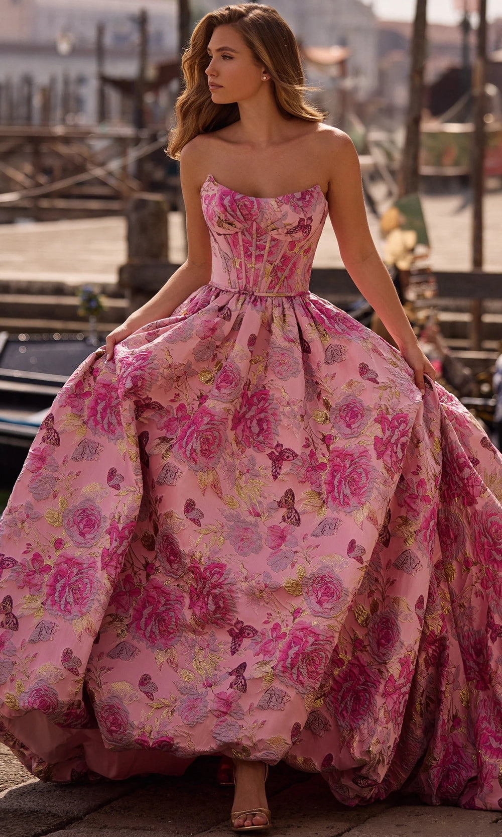 Fit for a fairytale, the Sherri Hill 57515 gown exudes luxury and femininity through intricate craftsmanship. Its strapless corset bodice sculpts the silhouette with precision while offering subtle support and structure. The metallic floral pattern shimmers under light, highlighting the soft tones with elegant depth. A voluminous ballgown skirt flows from the natural waist, adding drama and grace to every step. For galas or evening receptions, the Sherri Hill 57515 creates a breathtaking presence with its timeless beauty and romantic design. Model is wearing Pink color.