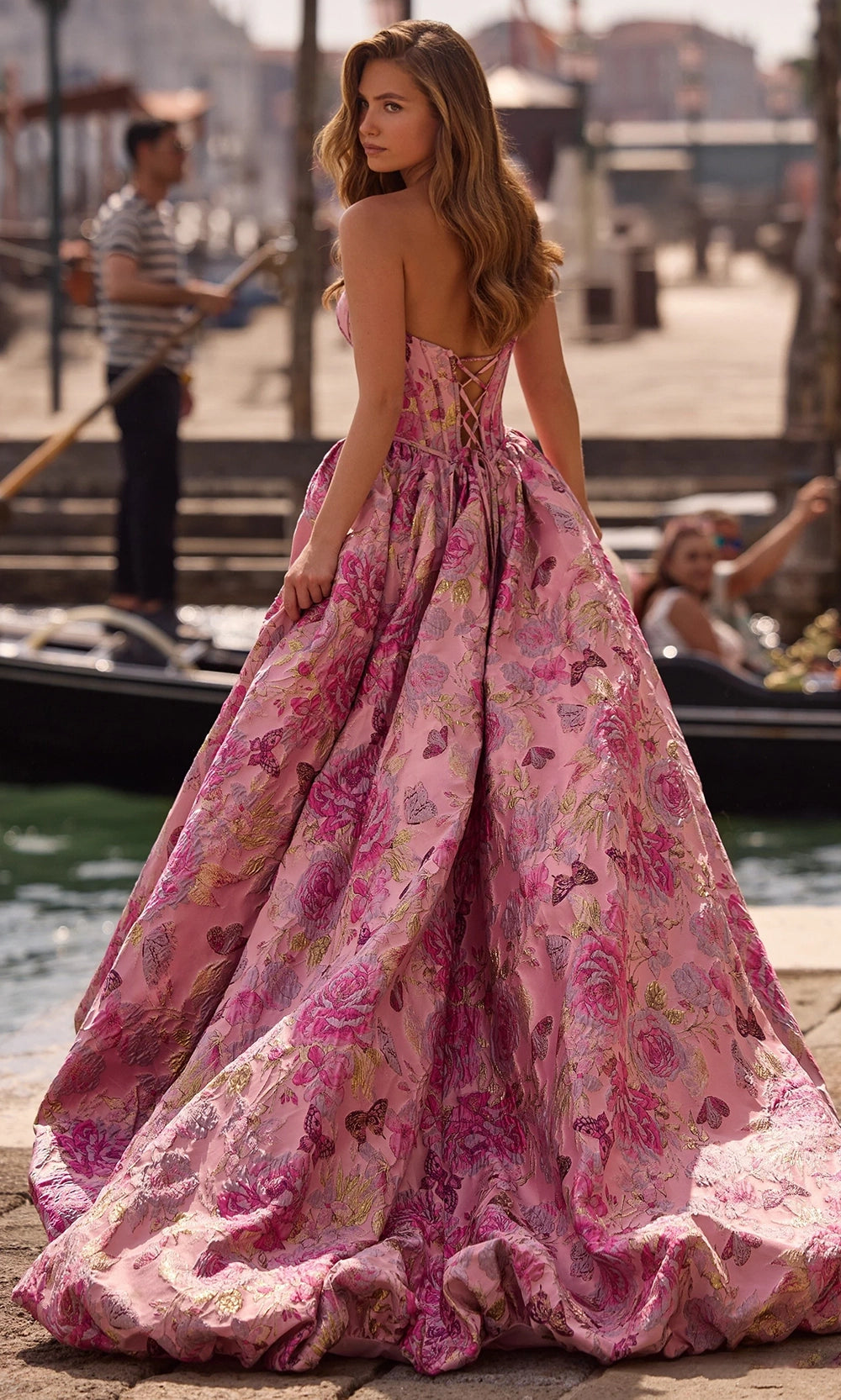 | Details: | Strapless Corset Bodice, Floral Pattern, Bubble Skirt, Pockets, Lace-Up Back |