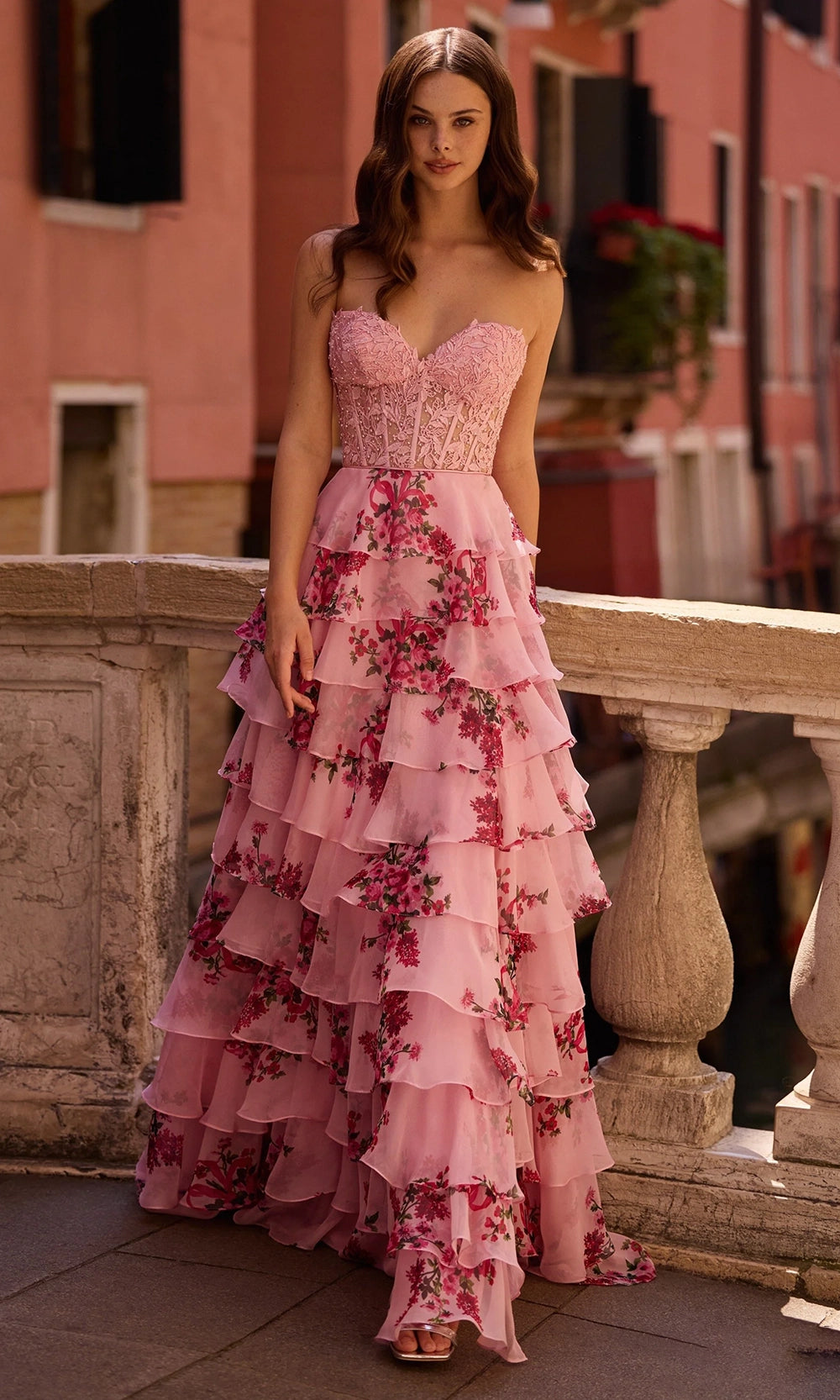 Playful movement and intricate artistry come together in Sherri Hill 57569, creating a look of pure sophistication. The strapless lace bodice enhances natural form, offering a touch of allure balanced by soft ruffles below. Layered floral tiers add texture and rhythm, flowing effortlessly in a full-length A-line silhouette. A charming lace-up detail completes the back, tying the design together with finesse. Sherri Hill 57569 delivers striking beauty that captures attention at any event or celebration. Model is wearing Pink Print color.