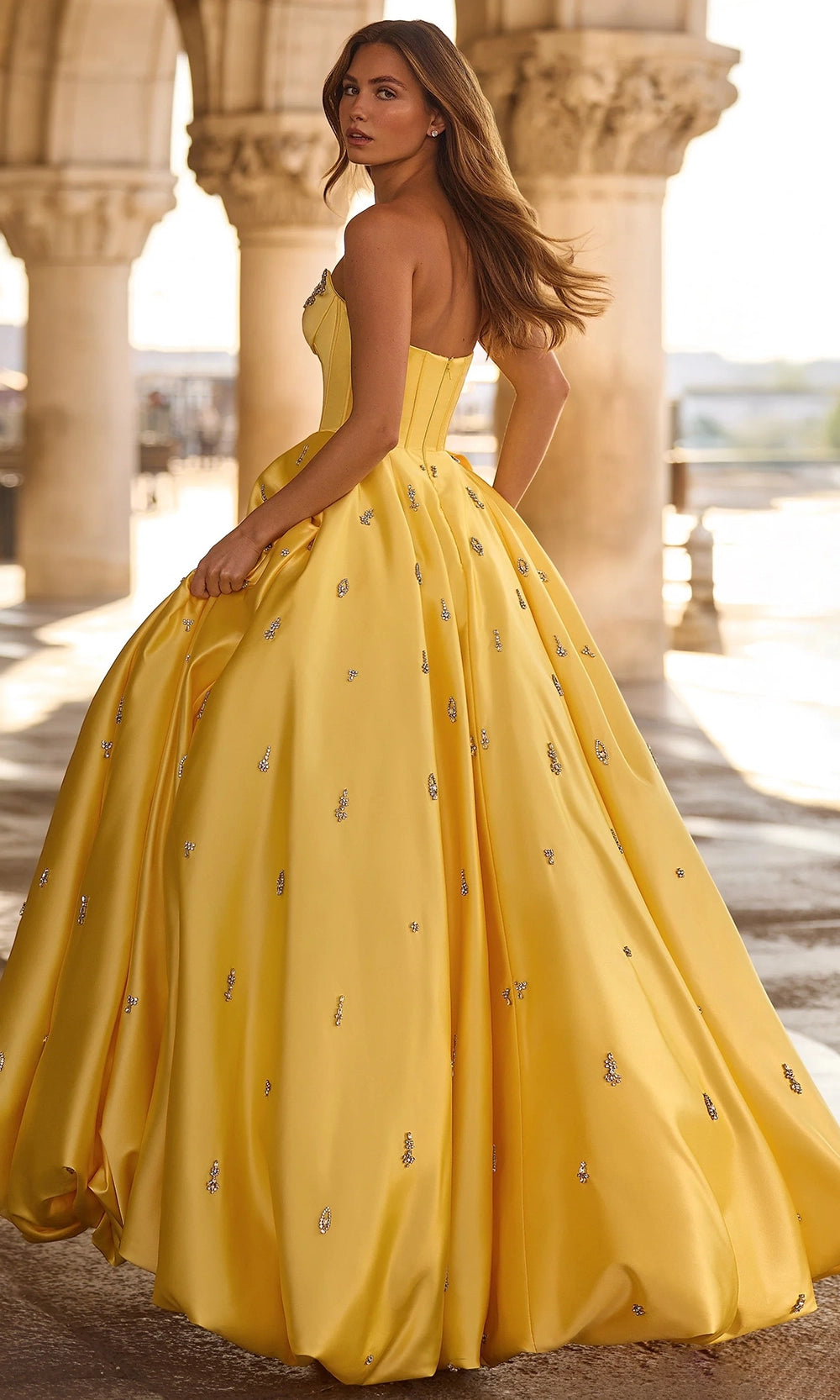 Sherri Hill 57575 brings a striking presence suited for grand entrances, offering a look that commands attention with its luminous finish and sculpted lines. The scoop neckline highlights the face beautifully, while the bubble ballgown skirt creates volume that moves with fluid grace. Scattered accents throughout the skirt catch the light in subtle flashes, enhancing depth and dimension. Ideal for ceremonies, galas, or milestone celebrations, this strapless style gives unforgettable impact. Choose Sherri Hill 57575 for an appearance that feels both elevated and memorable. Model is wearing Yellow color.