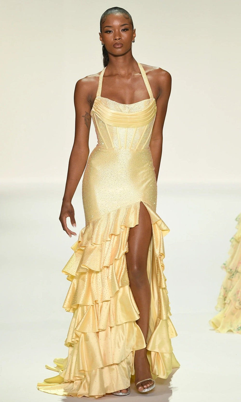 | Details: | Corset Boning Bodice, Sleeveless, Thigh-High Slit, Tiered Ruffle Skirt, Open Lace-Up Back, Beaded |