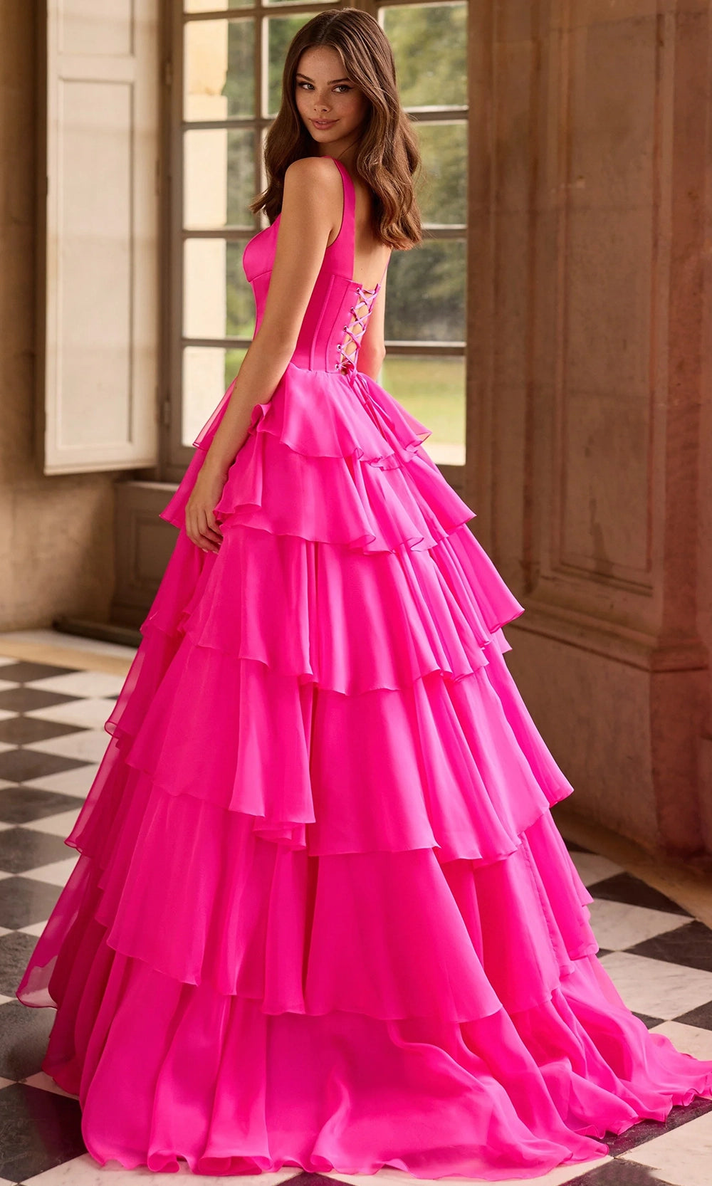 Refined design meets effortless grace in Sherri Hill 57625. The ballgown showcases a corset-inspired bodice that enhances the waistline, balanced by a sleek square neckline and thin straps. Each tier of the layered ballgown skirt adds movement and dimension, creating a look that feels both regal and contemporary. The high slit reveals just the right hint of leg, ensuring a confident entrance at any event. Perfect for those seeking a gown that embodies confidence and charm, Sherri Hill 57625 captures the essence of true red-carpet allure. Model is wearing Bright Pink color.