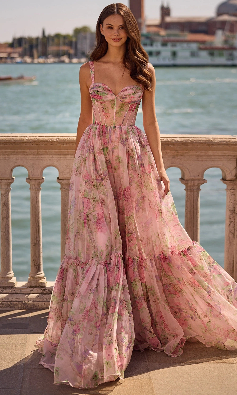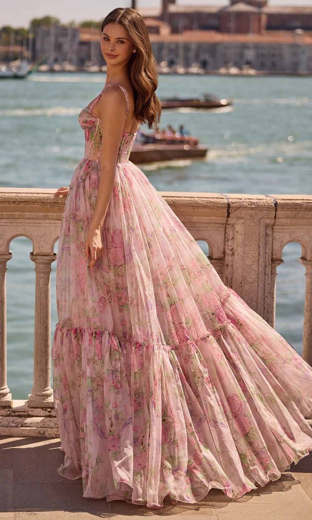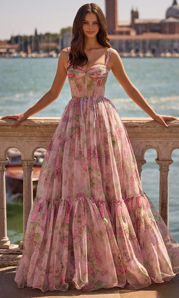 | Details: | Sleeveless, Illusion Corset Bodice, Printed Floral Design, Mid-Open Back, Tiered Full Skirt |