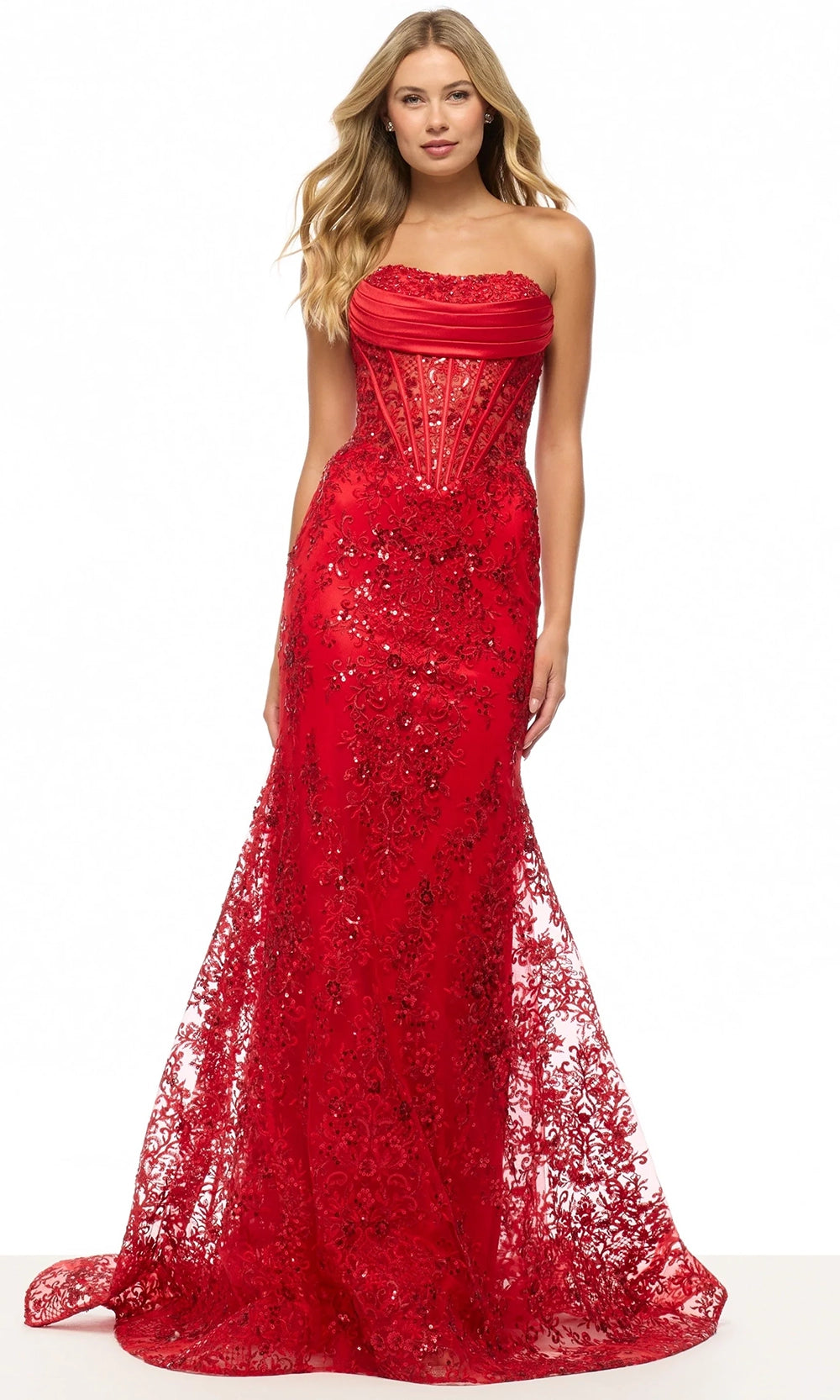 This Sherri Hill 57645 strapless mermaid gown captures the essence of sophisticated allure through its elegant silhouette and dazzling embellishment. The corset bodice sculpts the figure with precise structure, highlighted by sequin lace that enhances its sculpted form. The fitted shape accentuates curves before flaring gracefully at the hemline, creating a fluid motion with each step. Sherri Hill 57645 is the ultimate expression of refined artistry, perfect for special events where elegance and grace take center stage. Model is wearing Red color.