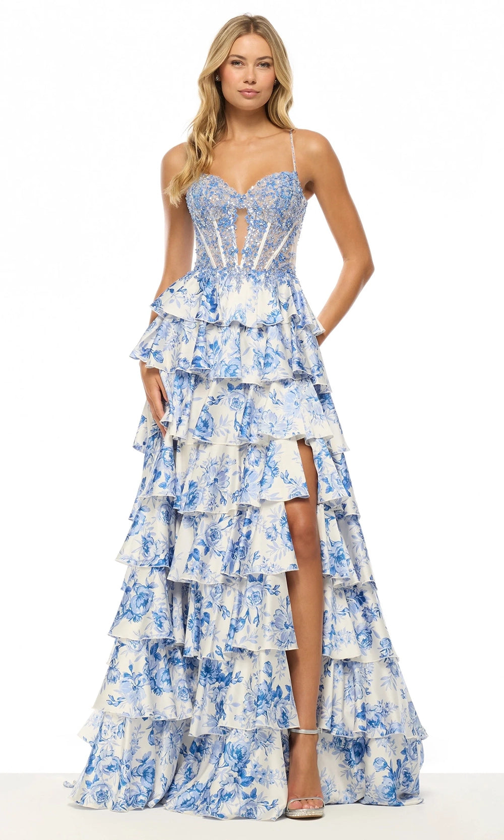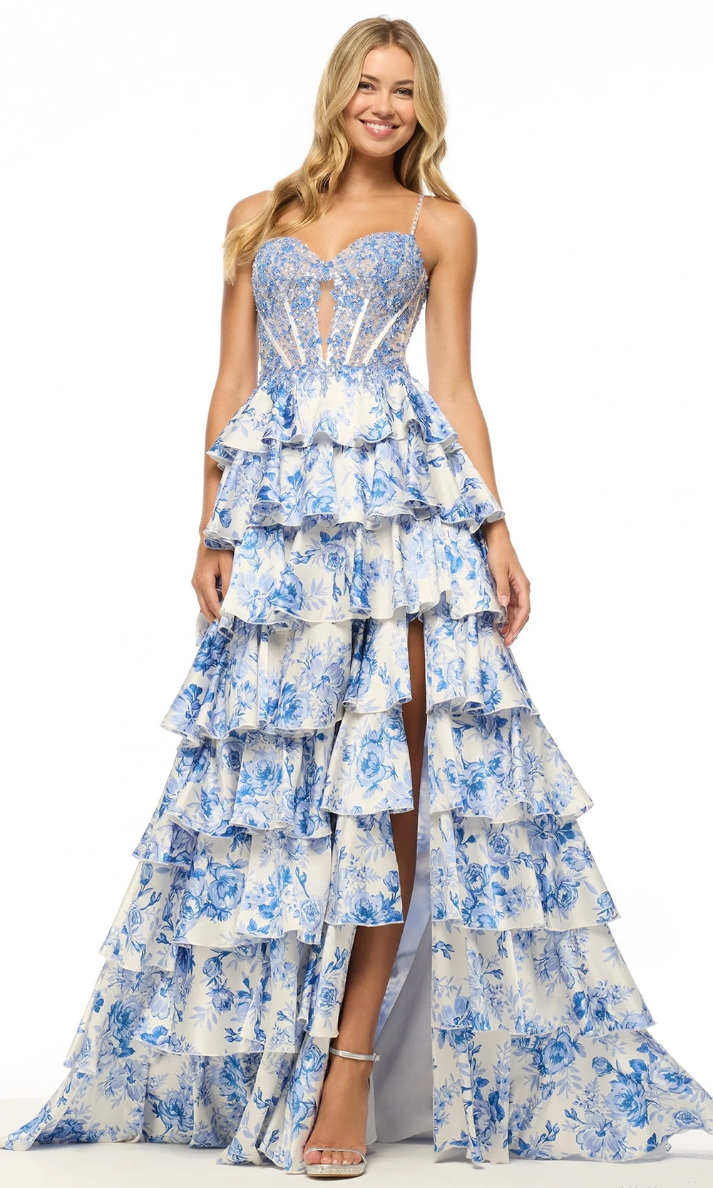 Ethereal and enchanting, Sherri Hill 57662 captures the essence of modern romance through an intricate play of texture and light. The sweetheart neckline paired with slender straps introduces a delicately beaded lace bodice that shapes the torso with elegant precision. A corset detail adds structure and dimension, blending seamlessly with the tiered ruffled A-line skirt. The floral print flows effortlessly, creating movement that mimics petals in motion. A daring slit enhances fluidity, while the graceful layers ensure sophistication. Sherri Hill 57662 exudes femininity and balance, tailored for unforgettable entrances. Model is wearing Ivory/Blue color.