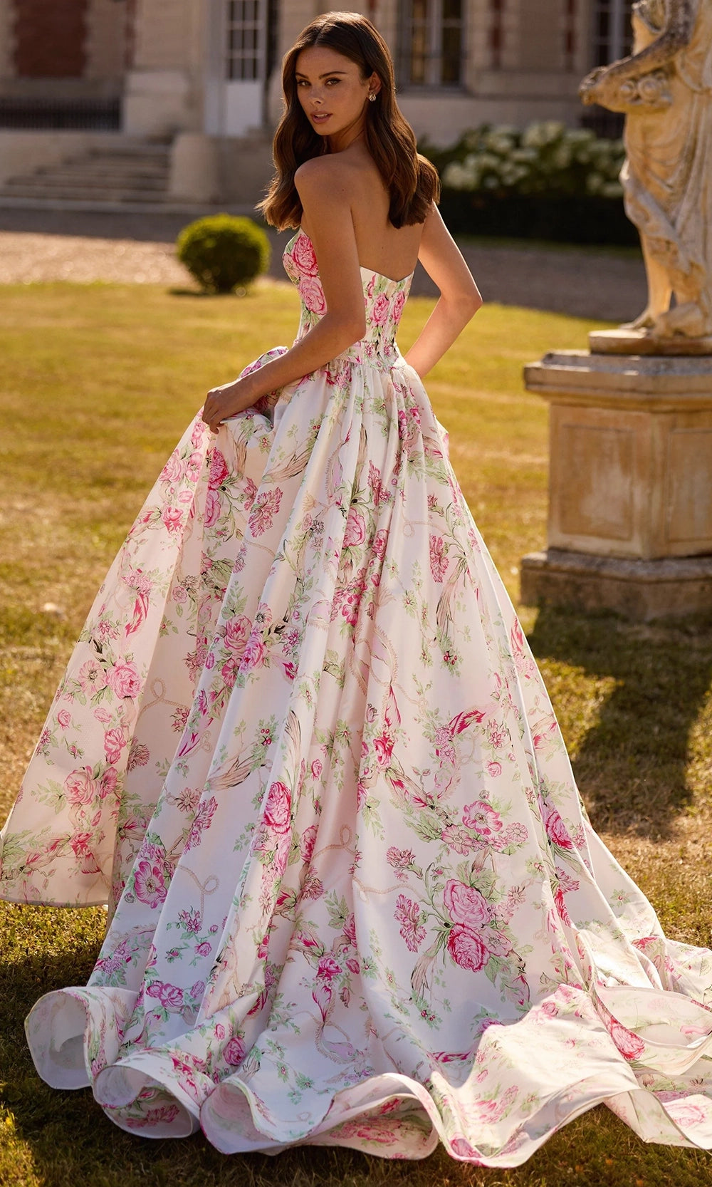 | Details: | All-Over Floral Print, Strapless, Oversized Bow at Waist, Concealed Back Zipper, Sweep Train |