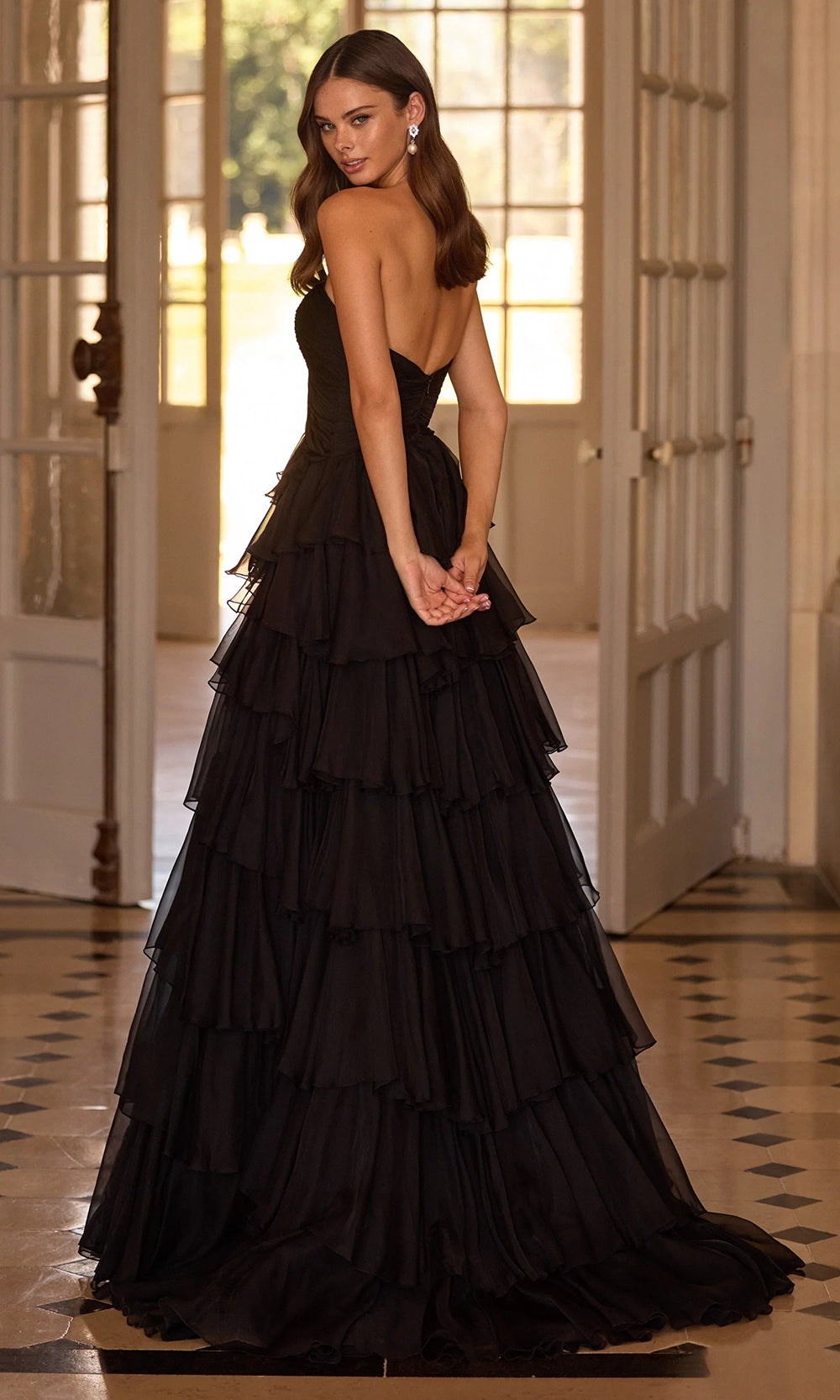 Radiating elegance from every angle, Sherri Hill 57673 is a dress that perfectly blends sophistication with modern movement. The strapless cut and sweetheart neckline frames the shoulders gracefully, while a ruched bodice sculpts the natural waistline to highlight the figure. Layers of soft ruffles cascade down the A-line skirt, offering depth and fluidity with each step. A thigh-high slit provides a bold yet refined accent, balanced by a sweeping train that completes the look. Designed for those who seek glamour with timeless style, Sherri Hill 57673 is a captivating choice for formal events and pageants. Model is wearing Black color.