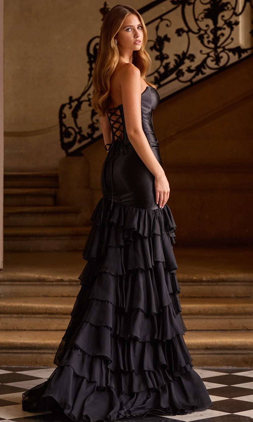 | Details: | Strapless, Bow Detail, Tiered Ruffle Skirt, High Slit, Ruched, Floor Length, Lace-Up Back |