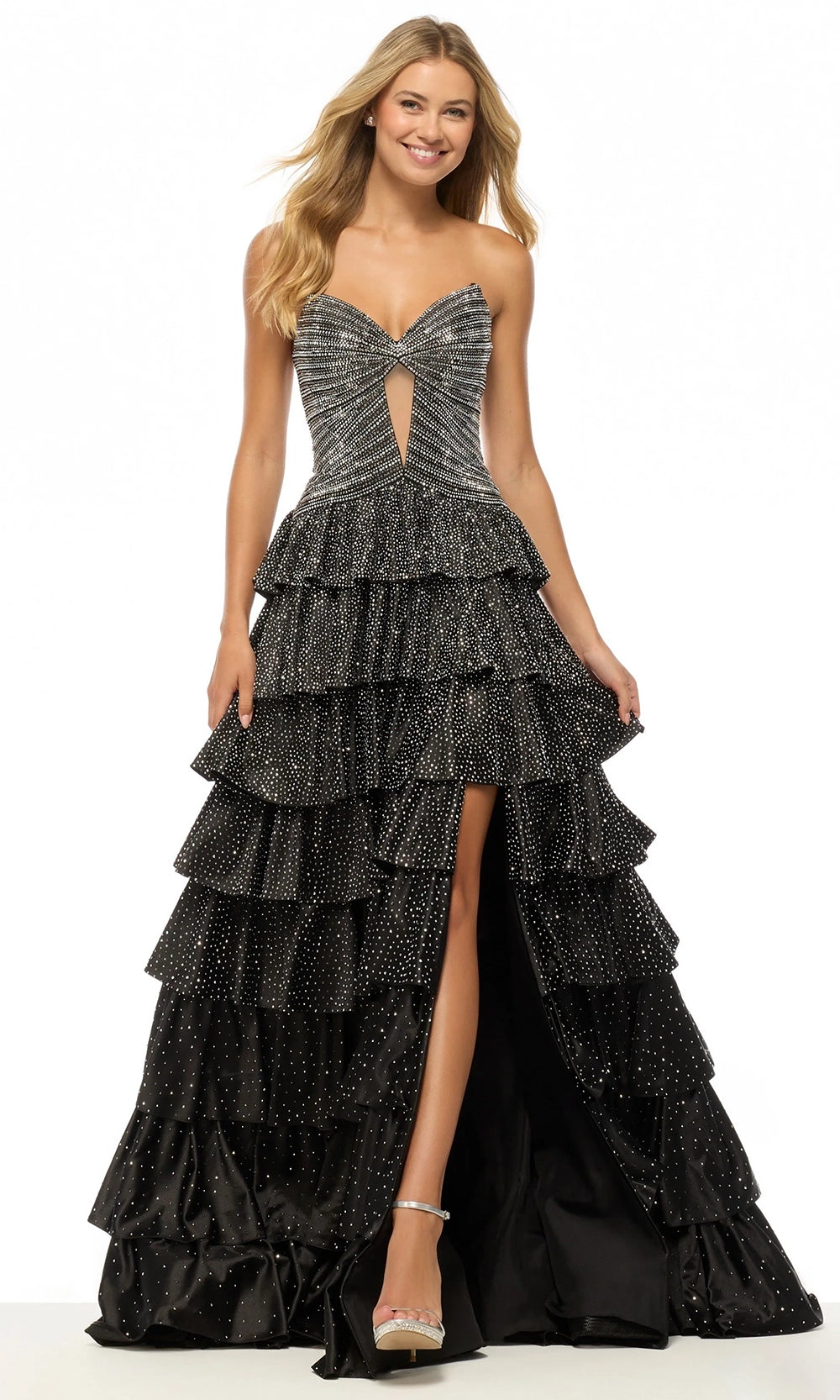 Strikingly bold yet exquisitely elegant, Sherri Hill 57700 redefines classic glamour. The gown features a structured strapless bodice with illusion keyhole cutout that adds allure and refinement. A tiered ruffle ballgown skirt flows gracefully with every step, enhanced by shimmering embellishments that catch the light beautifully. The thigh-high slit introduces an air of sophistication and movement, making the gown both dramatic and wearable. Designed for the woman who commands attention effortlessly, Sherri Hill 57700 radiates pure confidence and red-carpet poise. Model is wearing Black color.