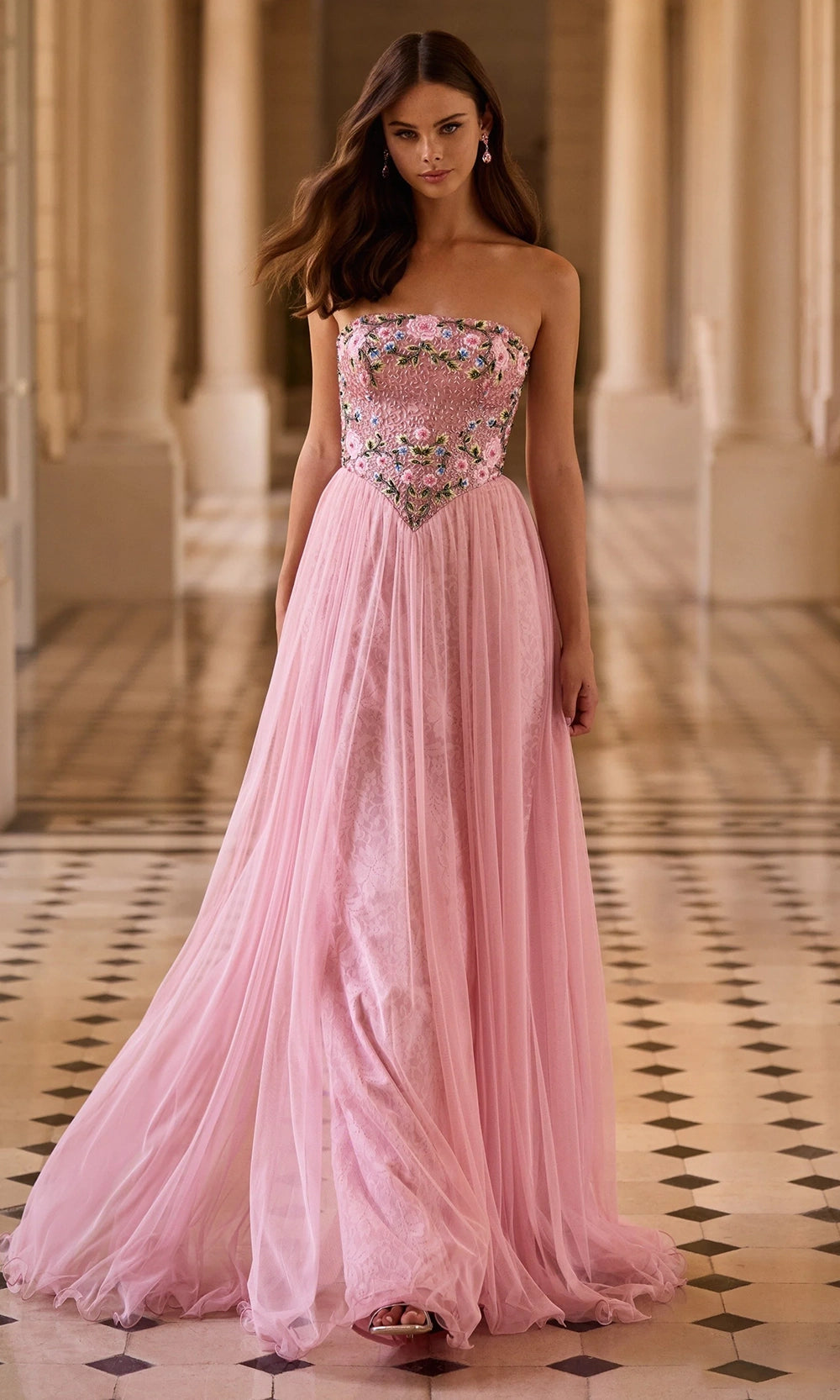 | Details: | Strapless, Beaded Floral Bodice, Lace Underneath, Open Back, Flowing Gathered Skirt |