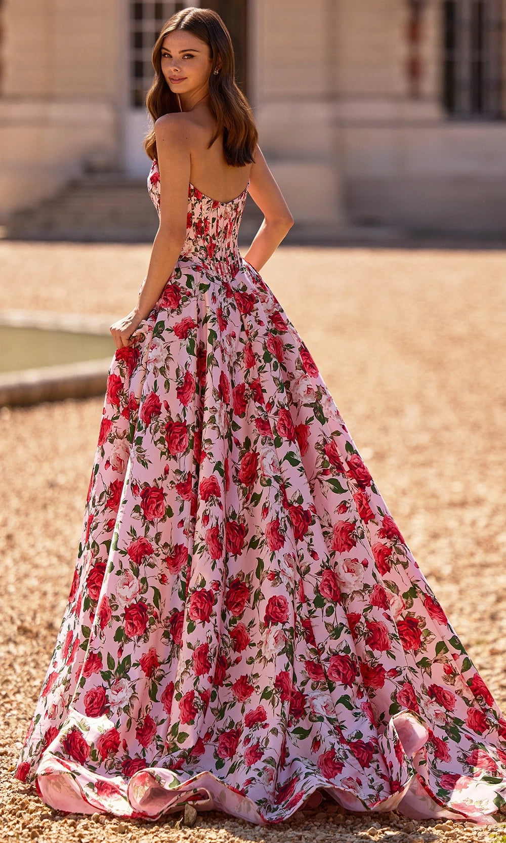 | Details: | Exposed Boning, Strapless, Floral Print, High Slit, Open Back, Sweep Train |