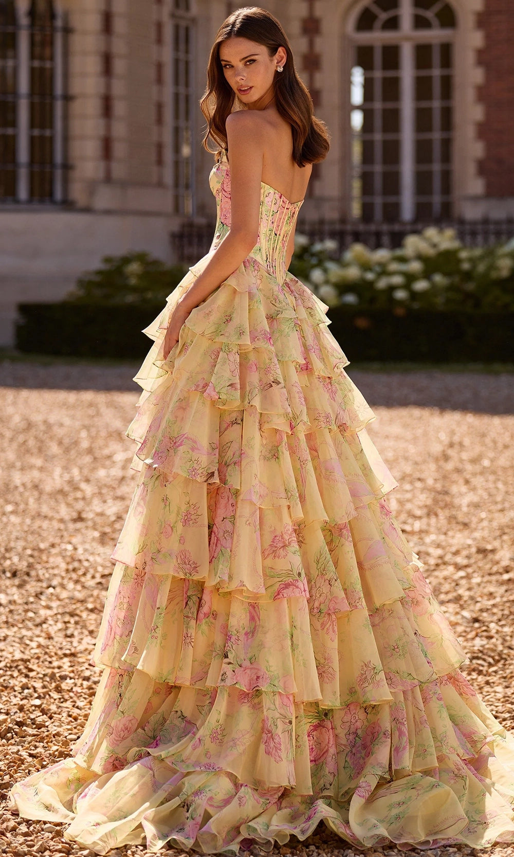 A vision of modern romance, the spectacular Sherri Hill 57727 captures attention through intricate layers and delicate detailing. The strapless bodice is tailored with a structured fit, while the ruffle tiered A-line skirt brings volume and movement. Subtle bead accents illuminate the scoop neckline, enhancing the floral pattern soft charm. A daring slit complements its flowing design, perfect for formal evenings that call for elegance and poise. Celebrate unforgettable moments in the dreamy beauty of Sherri Hill 57727. Models are wearing Light Yellow Print, and Pink Print colors.