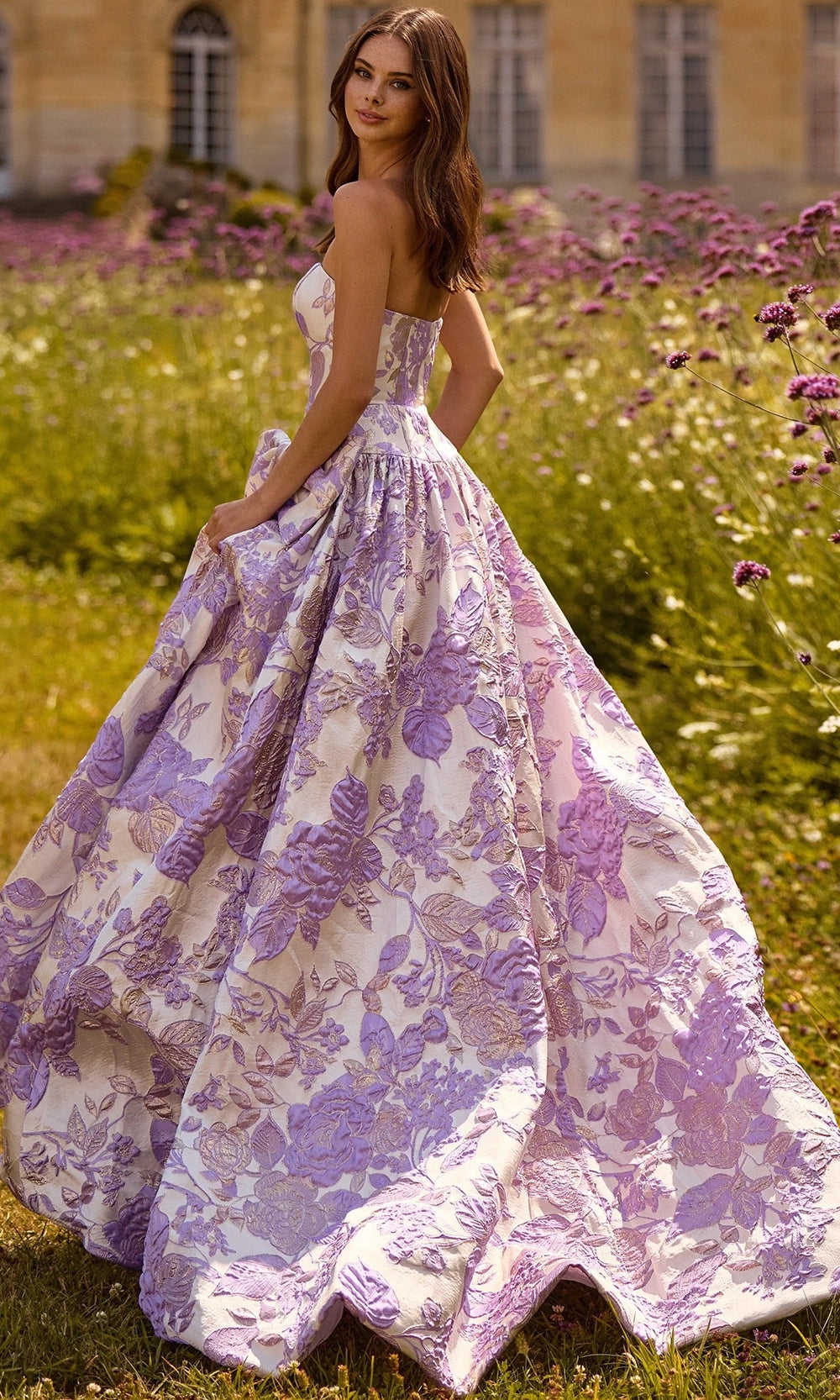 An ode to timeless femininity, the Sherri Hill 57730 captivates with its romantic floral design and dramatic shape. A sleek strapless cut and straight neckline crowns the bodice, while a grand bow detail defines the waistline. The voluminous ballgown skirt flows gracefully, creating a captivating sense of movement and proportion. With its enchanting floral pattern and tailored finish, this gown brings contemporary freshness to a regal silhouette. Sherri Hill 57730 evokes beauty, confidence, and a lasting impression at any special occasion. Model is wearing Ivory/Lilac color.