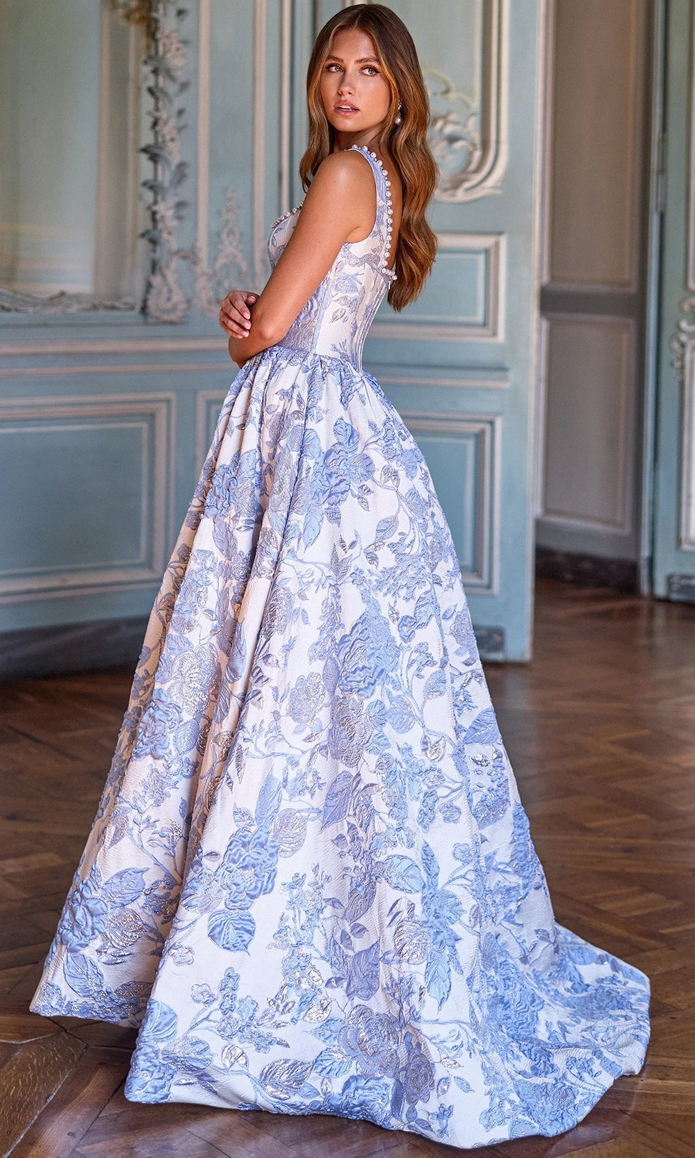 Impeccable structure and romance unite in the Sherri Hill 57731, a gown created for lasting impressions. A tailored scoop neckline complements the fitted bodice, while the full ballgown skirt adds depth and grandeur. Delicate floral motifs and pearl accent highlight the gown refined artistry, creating visual richness from every angle. Ideal for formal events or galas, it offers a luxurious interpretation of timeless femininity. Sherri Hill 57731 celebrates poise and artistry through its impeccable silhouette and design. Model is wearing Ivory/Light Blue color.