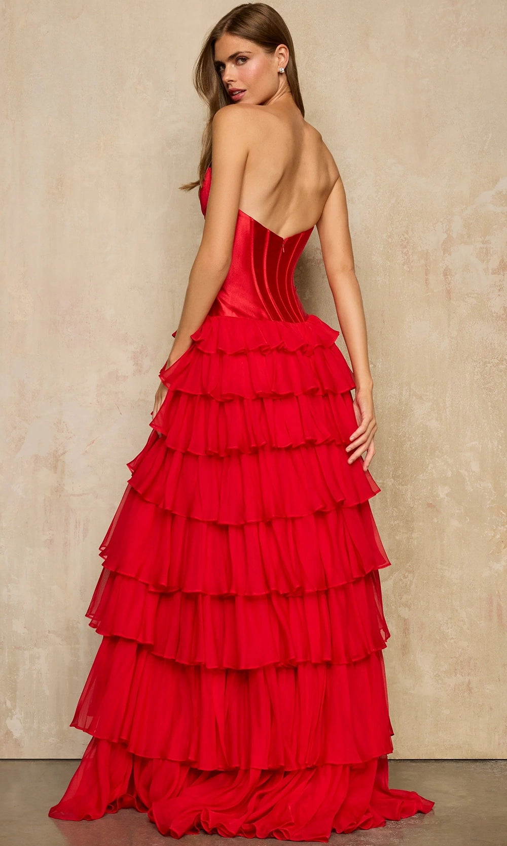 | Details: | Corset-Style Bodice, Strapless, Tiered Ruffle Skirt, Bow Accent, High Slit, Floor Length, Illusion Cutout |