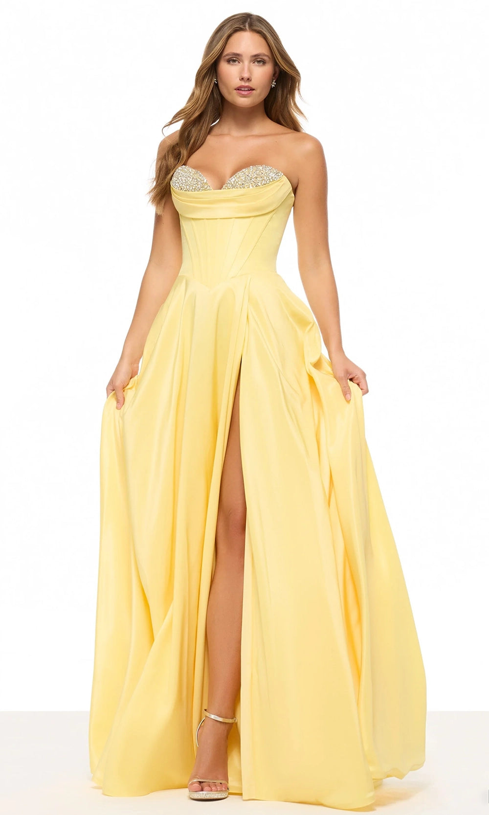 | Details: | Embellished Bust, Strapless Bodice, Exposed Boning, High Slit, Back Zipper Closure |