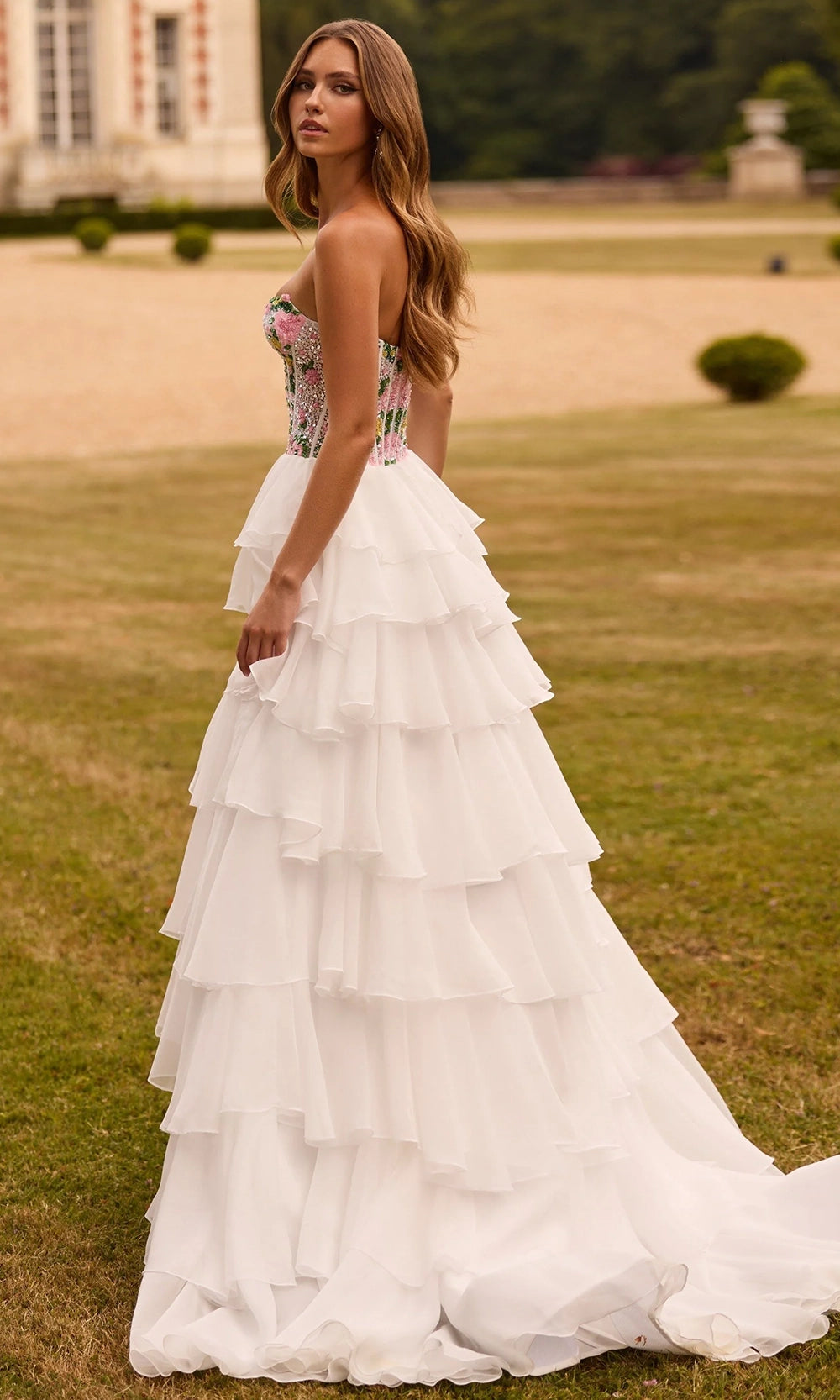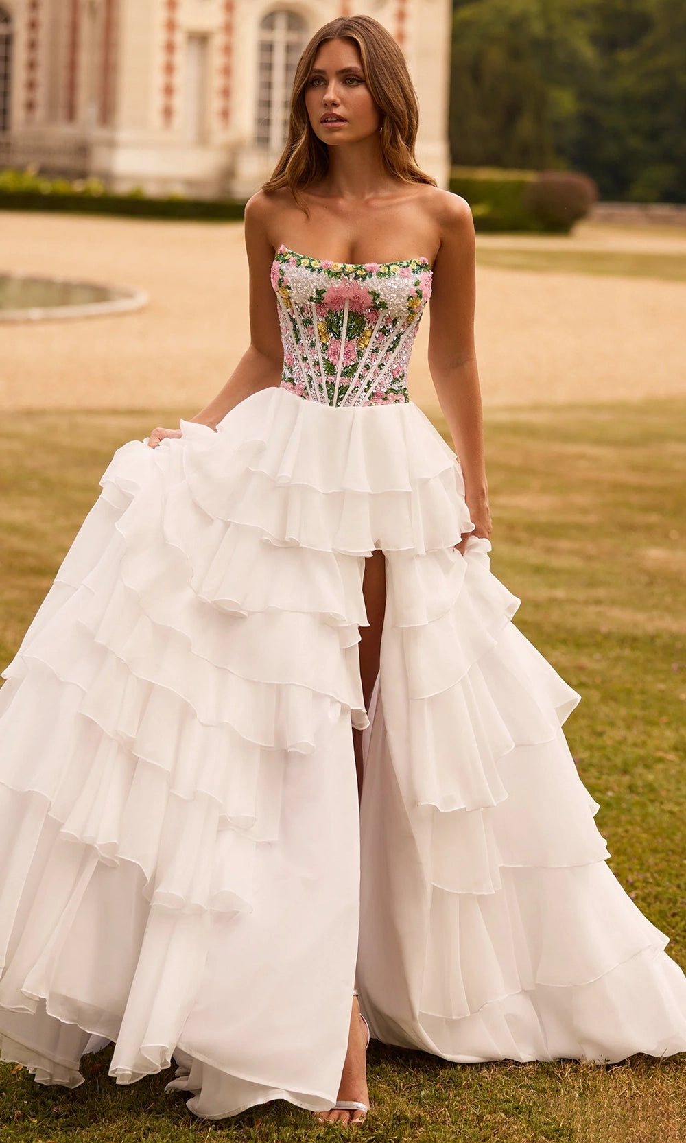 | Details: | Floral Beadwork, Strapless, Corset Bodice, Tiered Ruffle Skirt, High Slit, Sweep Train |