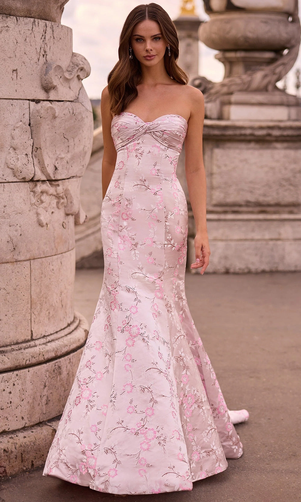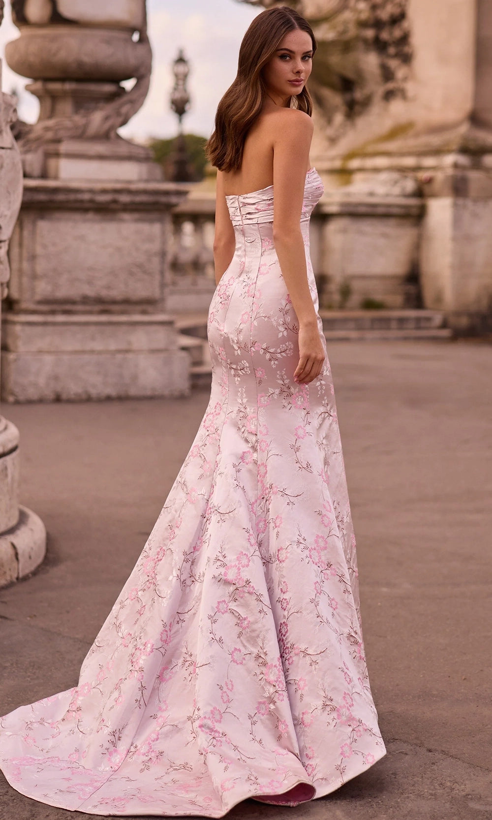 | Details: | Twisted Bodice Detail, Floral Pattern, Strapless, Back Zipper Closure, Sweep Train |