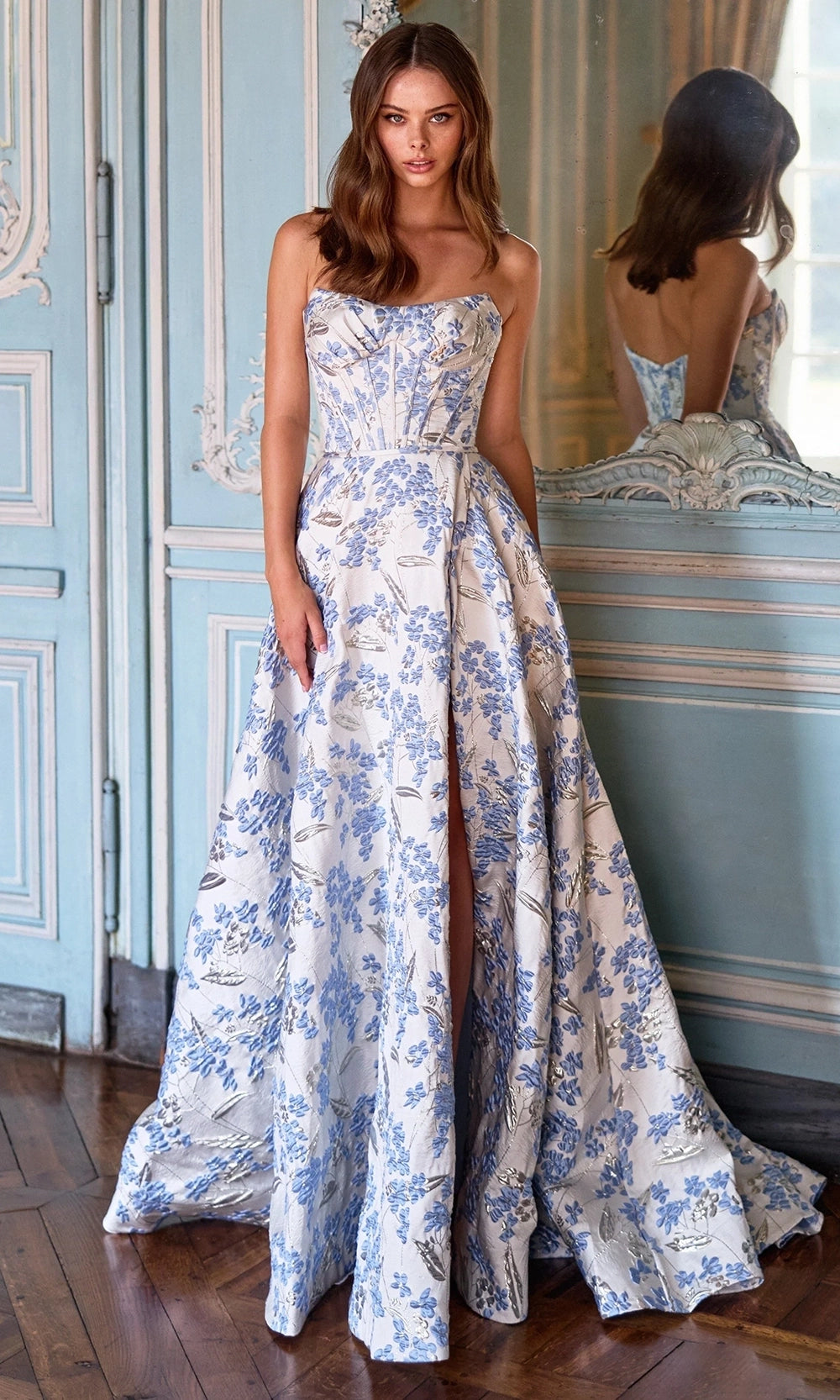 Evening gatherings feel elevated and enchanting when Sherri Hill 57755 comes into view. The strapless scoop neckline anchors the beautifully corset bodice, allowing the soft floral pattern to shine. A voluminous A-line skirt unfolds with graceful presence, enhanced by a slit that adds gentle movement. The natural waist provides balance and structure while maintaining a romantic profile throughout. Choose Sherri Hill 57755 to create a captivating impression at your next special event. Model is wearing Light Blue color.