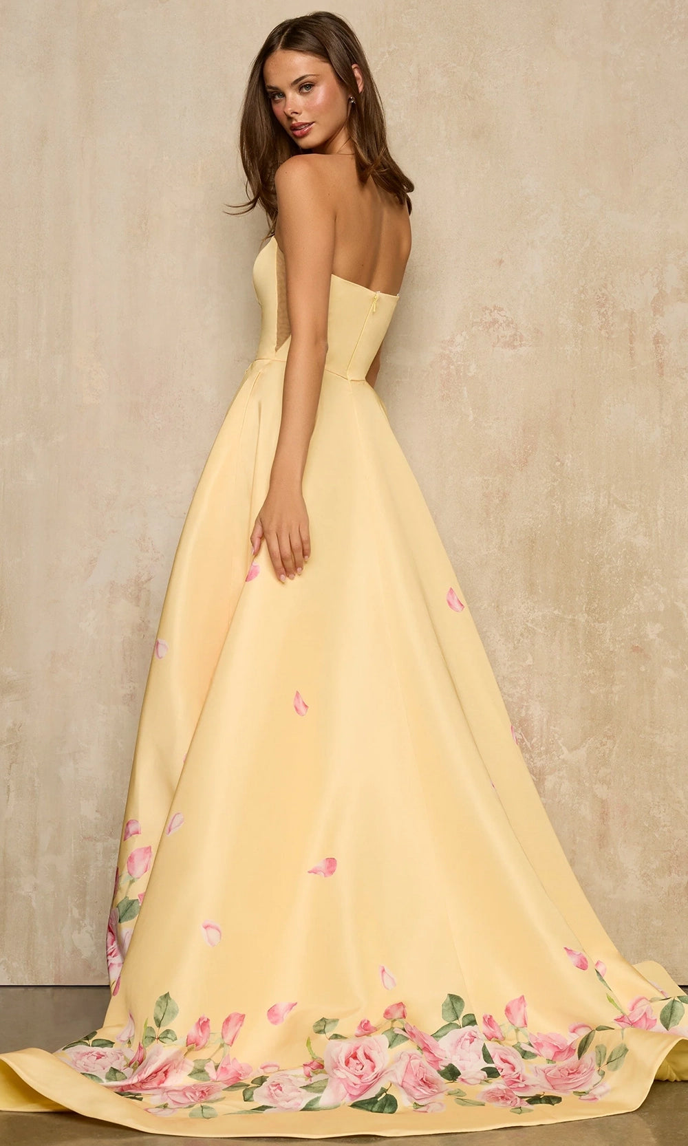 Soft femininity meets graceful design in the Sherri Hill 57760, an enchanting gown that captures subtle sophistication. Its strapless straight-across neckline complements a structured bodice, flowing into a beautifully flared A-line skirt that features hidden pockets for comfort and convenience. The floral border along the hem adds a touch of artistry, giving the gown depth and charm. Finished with a front slit for modern appeal, it brings effortless movement and allure to every step. Sherri Hill 57760 combines timeless poise with fresh detail for any elegant occasion. Model is wearing Yellow Print color.