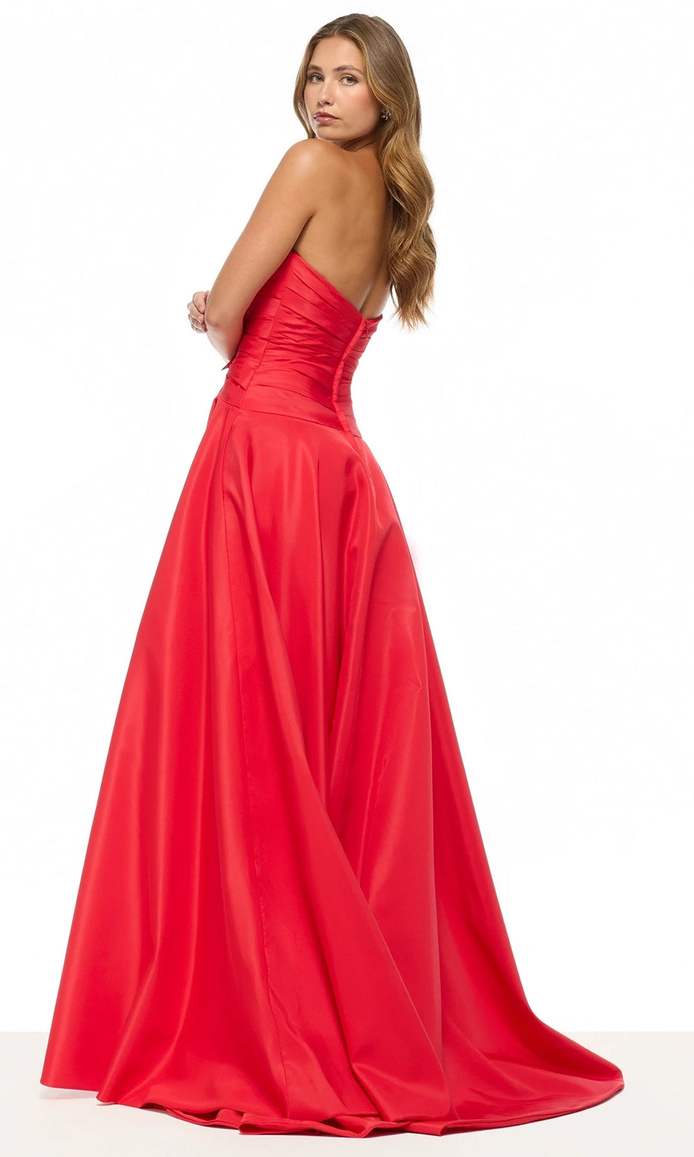 | Details: | Pleated Bodice, Cutouts, Bow Accents, High Slit, Strapless, Open Back, Floor Length |