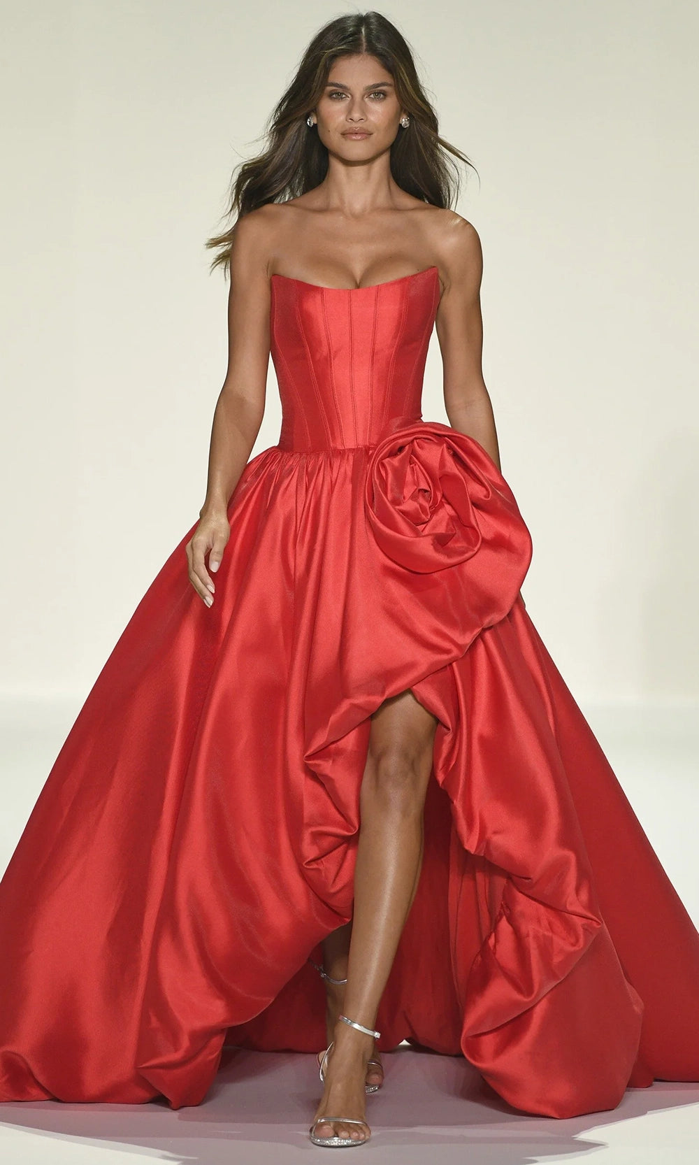 A captivating masterpiece that turns every moment into a statement, this Sherri Hill 57778 strapless ballgown redefines classic glamour. Its sculpted bodice flows into a voluminous bubble skirt, accented by a breathtaking oversized rose detail at the hip. The high slit adds fluid movement and allure, perfectly complementing the gown architectural design. With a beautifully created scoop neckline, the design delivers both timeless sophistication and modern confidence. Sherri Hill 57778 transforms formalwear into an unforgettable expression of artistry and presence. Model is wearing Red color.