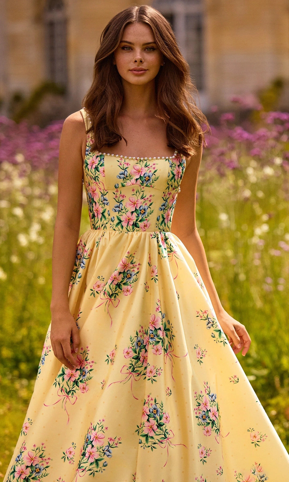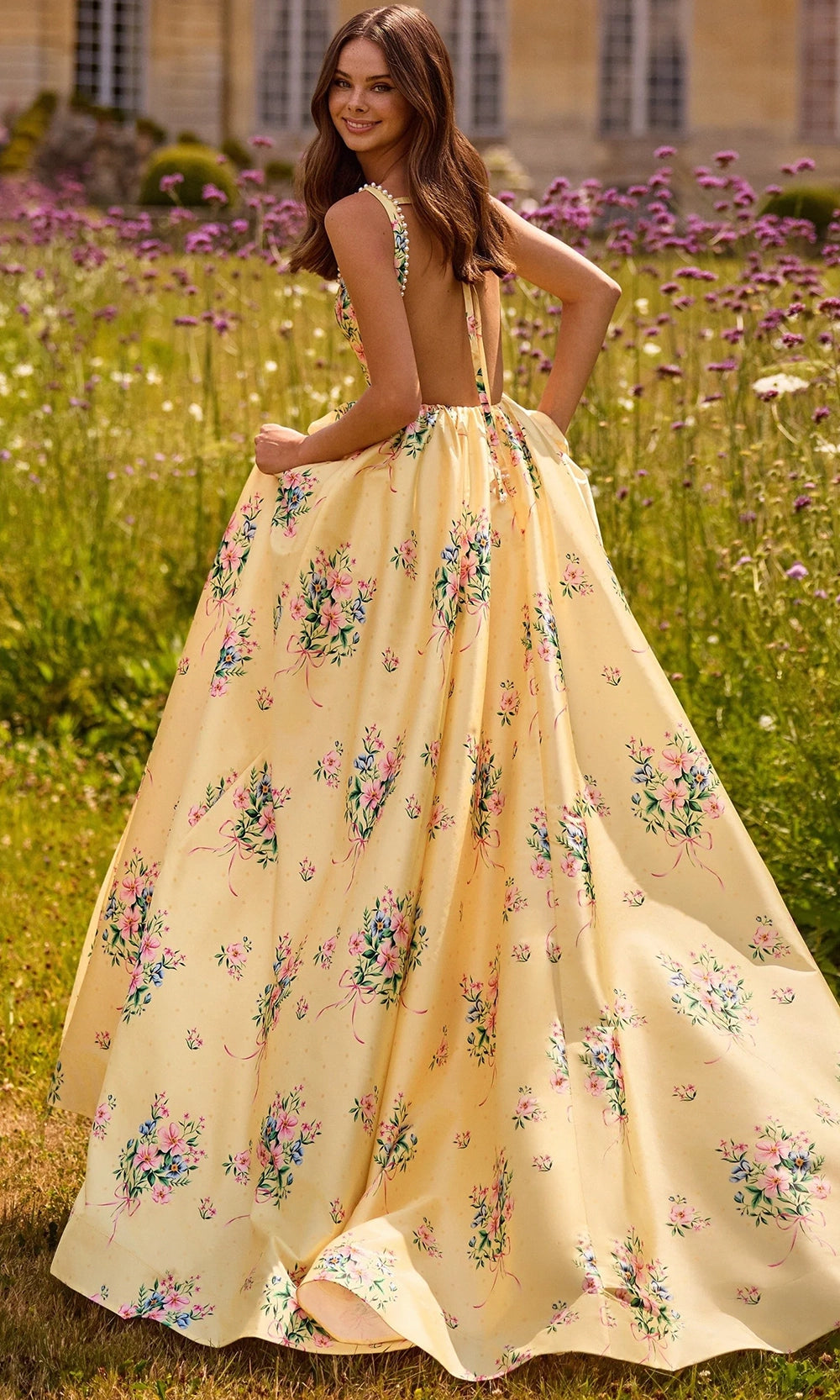 Natural charm meets classic design in Sherri Hill 57783, reflecting poise and modern flair. The square neckline and sleeveless cut create a balanced frame for the fitted bodice. A voluminous A-line skirt flows gracefully, capturing elegance in motion with each step. Floral prints highlight texture and dimension, complementing the dress sculpted shape. Sherri Hill 57783 creation offers a graceful expression of femininity, suited for grand occasions and garden-inspired soirees. Model is wearing Light Yellow Print color.