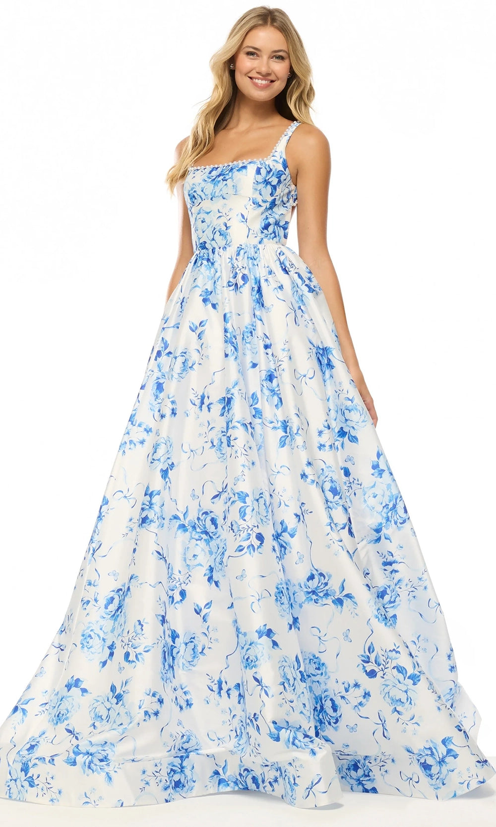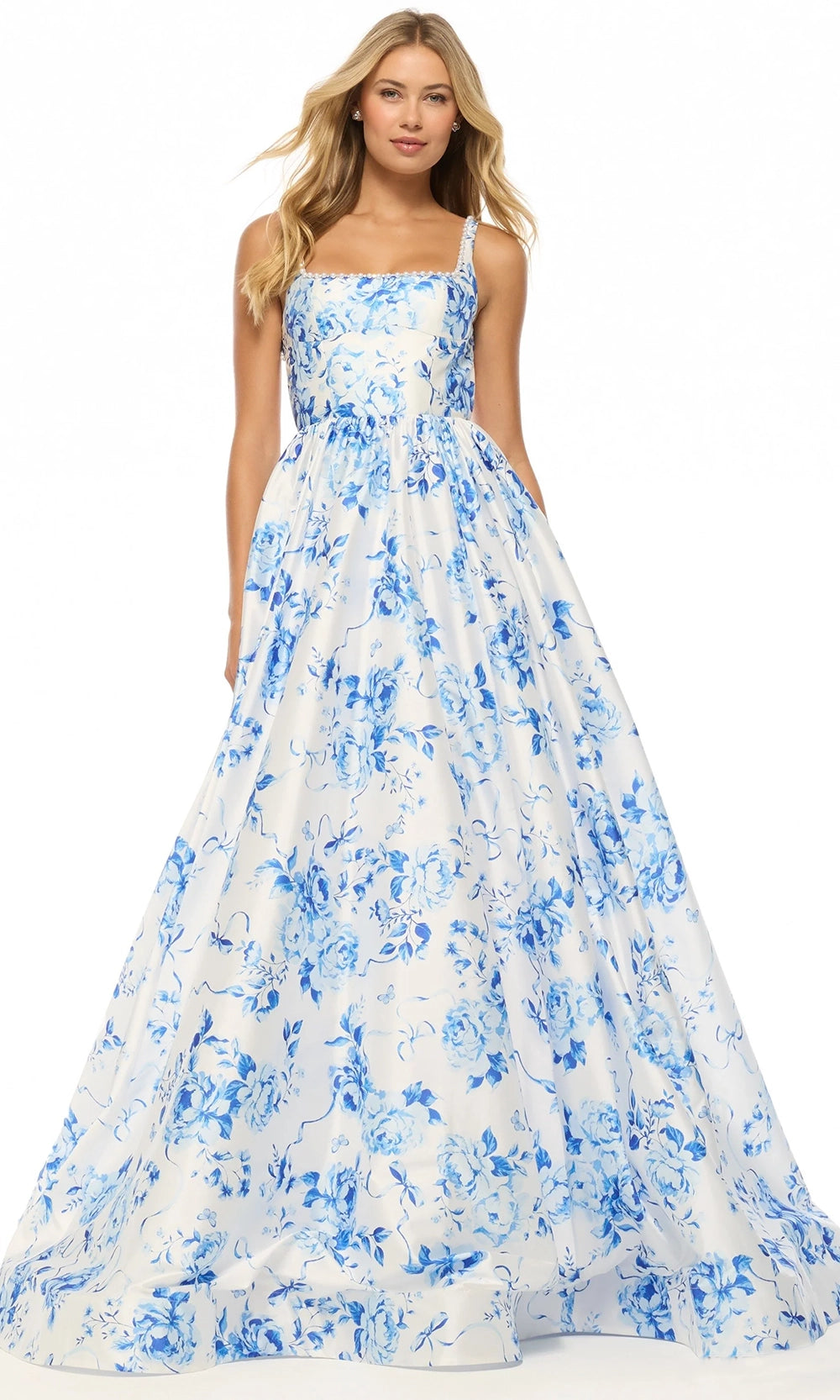 Make a graceful statement wearing the Sherri Hill 57789, a fit and flare dress that exudes timeless beauty and charm. The fitted bodice with a pearl-trimmed square neckline and thin straps frames the shoulders beautifully, while the natural waistline flows into a voluminous A-line skirt that enhances the feminine silhouette. A romantic floral pattern adds dimension and depth, giving the dress a soft and luxurious appeal. Perfect for proms, galas, or any upscale celebration, the Sherri Hill 57789 invites you to embrace a look that is both captivating and unforgettable. Model is wearing Ivory/Blue Print color.