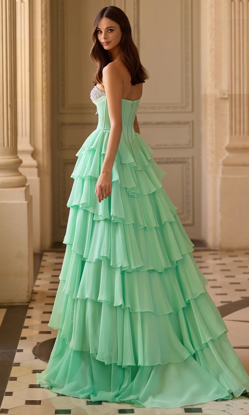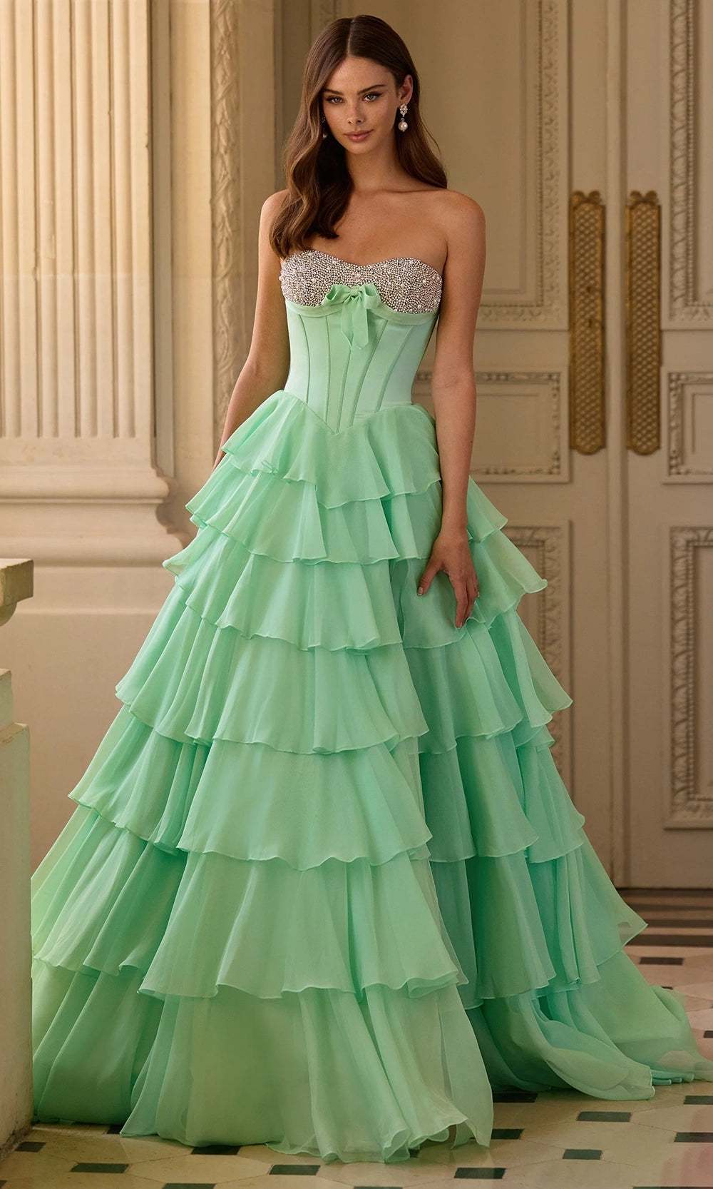 | Details: | Pearl and Beaded Accents, Corset Bodice, Bow Detail, Tiered Ruffle Skirt, High Slit, Strapless |