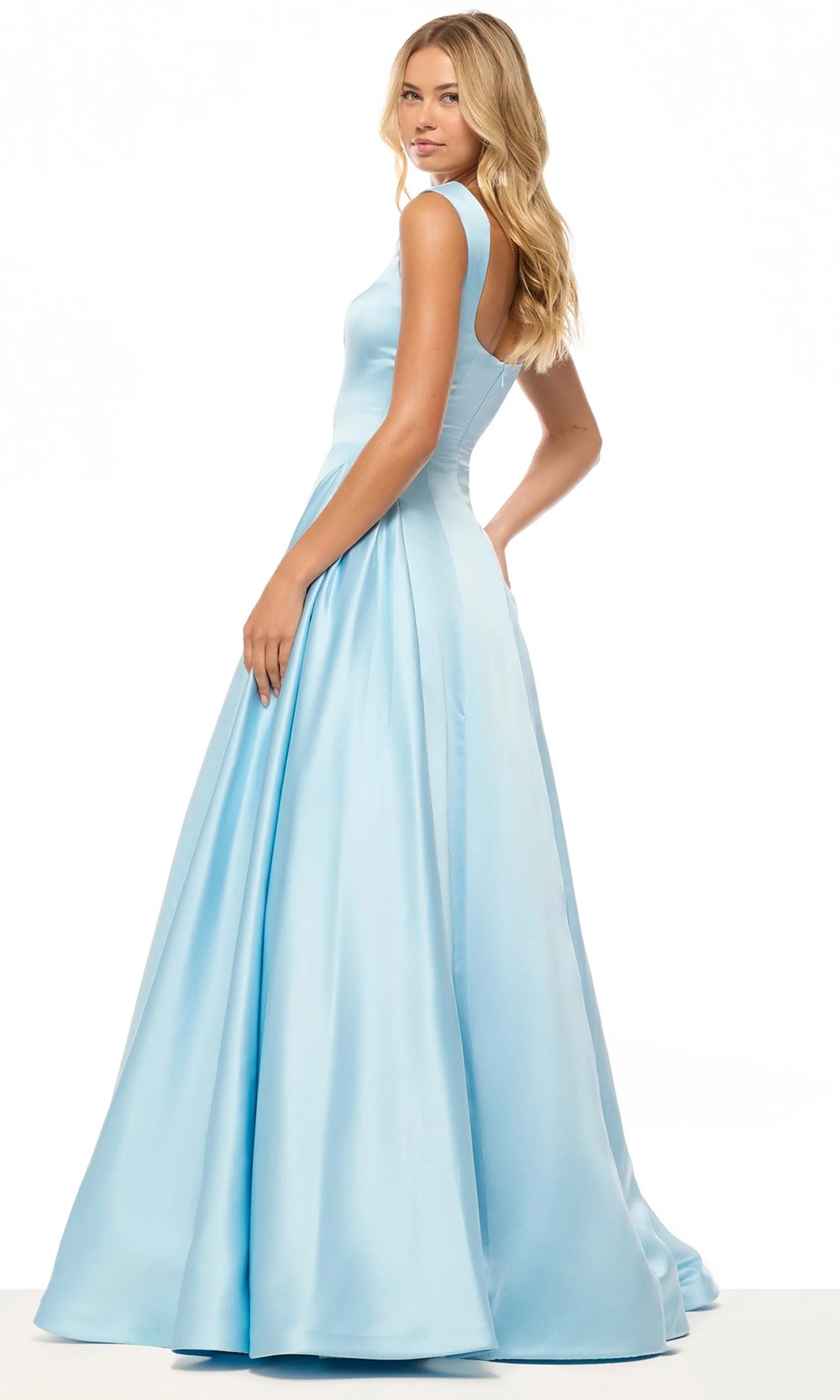 Sherri Hill 57835 embodies classic elegance designed for the modern woman. The square neckline and structured bodice showcase refined simplicity, while the back captivates with its elegant scoop cut and sleek zipper closure. The ballgown skirt creates dramatic volume, balanced by the pleated sides for a contemporary twist. The gown flowing lines and subtle sheen evoke effortless poise, ideal for formal events or ballroom evenings. Distinguished by understated beauty, Sherri Hill 57835 is a celebration of sophisticated femininity. Model is wearing Light Blue color.